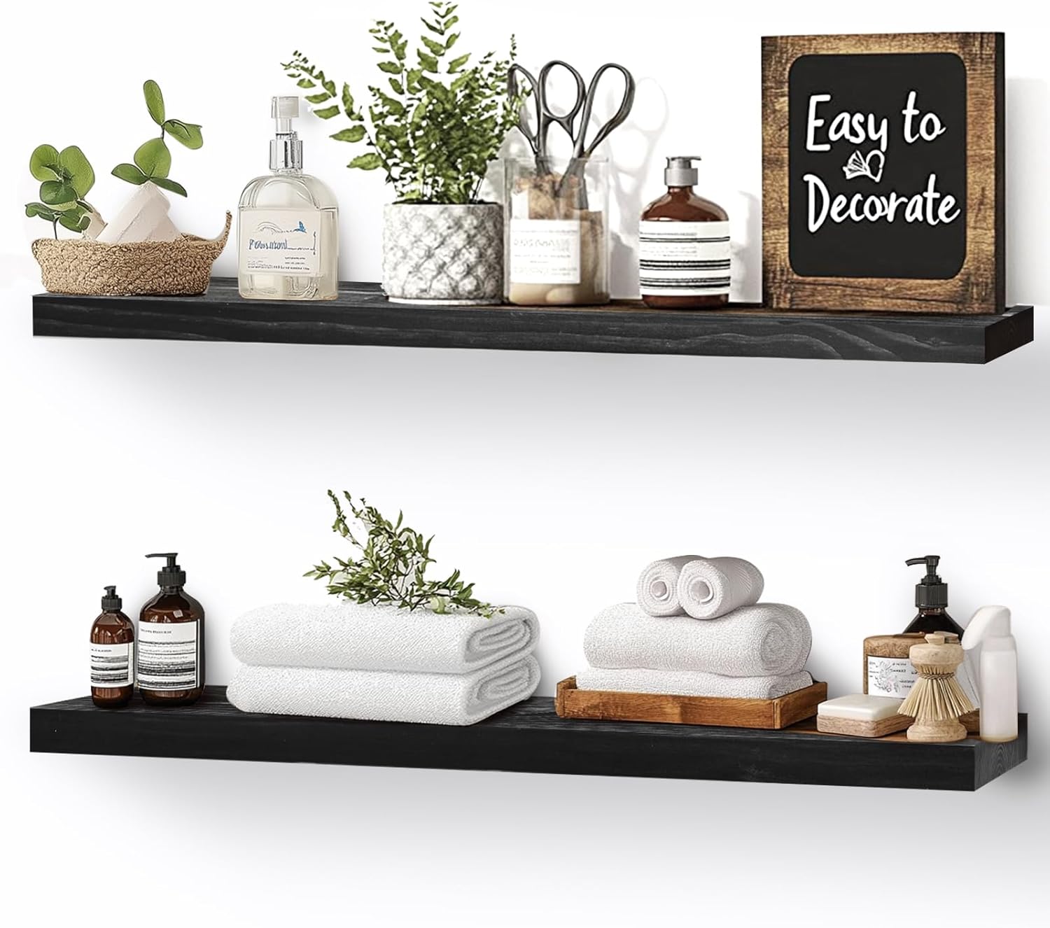 Floating Wall Shelves 2-Pack - Rustic Black 16-inch Wooden Wall Shelves for Storage and Décor, Multi-Functional and Easy to Install for Living Room, Bedroom, and Kitchen