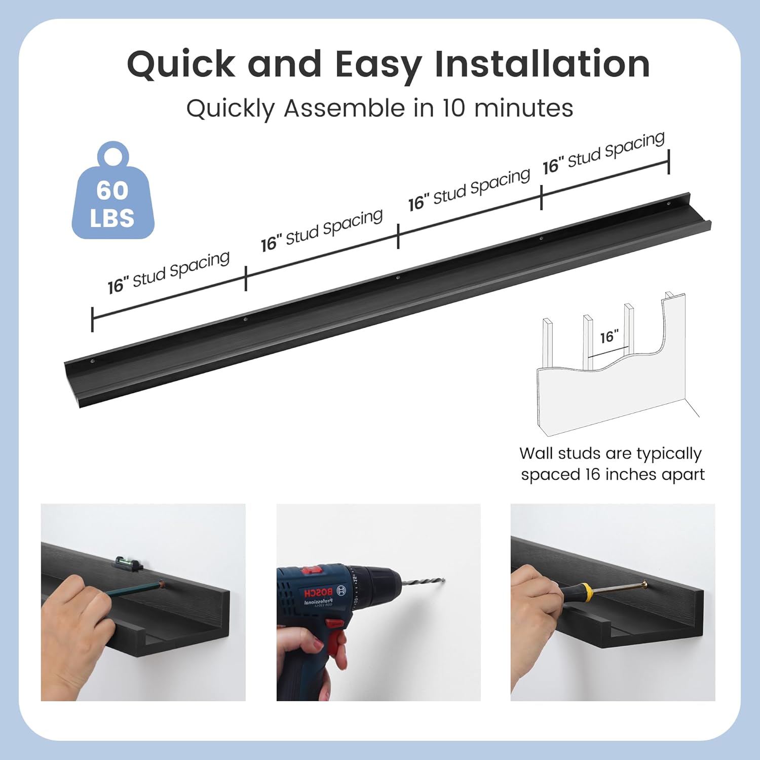 - Easy to Install: You will get a level, screws for the wall, drywall anchors, a detailed installation guide, and two beautiful hand-crafted solid pine wood shelves. With the level, you can make sure your picture ledge shelves are well aligned. Just follow the simple instruction to install the hanging shelves for wall decor within 10 minutes. We add additional screw and anchor to the hardware bag just in case. If you have any questions about our products, please feel free to contact us