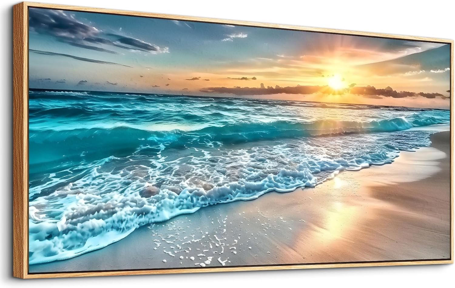 hyidecorart Large Wall Art For Living Room Wall Decor For Bedroom Office Wall Decor Wood Framed Canvas Wall Painting Blue Sea Wave Pictures Modern Beach Seascape Posters Home Decorations Artwork