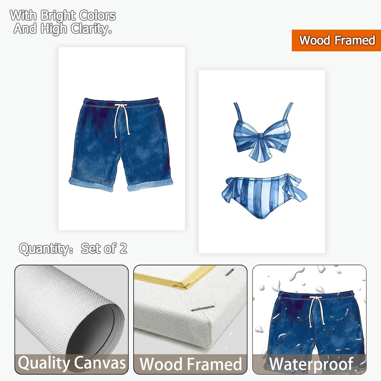 Liyark Set of 2 Retro Navy Blue And White Swimsuit Art Posters Beach Bathing Suit Prints Painting Beach House Wall Art Coastal Wall Decor Pictures For Bathroom Home Decoration 24x36in Framed