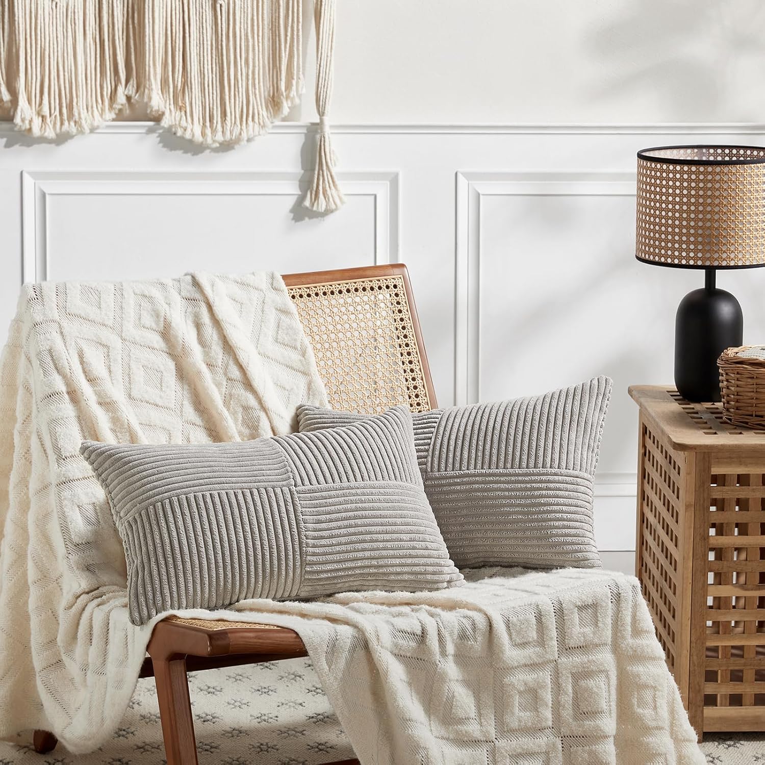 Fancy Homi 2 Packs Neutral Grey Lumbar Decorative Throw Pillow Covers 12x24 Inch for Living Room Couch Bed Sofa, Farmhouse Home Decor, Soft Striped Corduroy Rectangle Accent Cushion Case 30x60 cm
