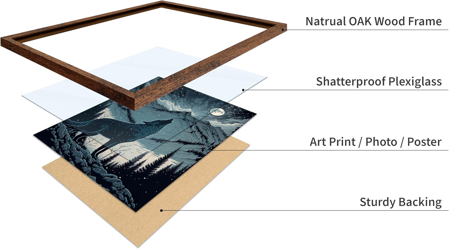 Poster Master Vintage Illustration Poster - Retro Animal Print - Gift for Artist, Friend - Wolf Howling at the Moon, Mountain, Snow, Landscape - Wall Decor for Home, Office, 11x14 Brown Framed