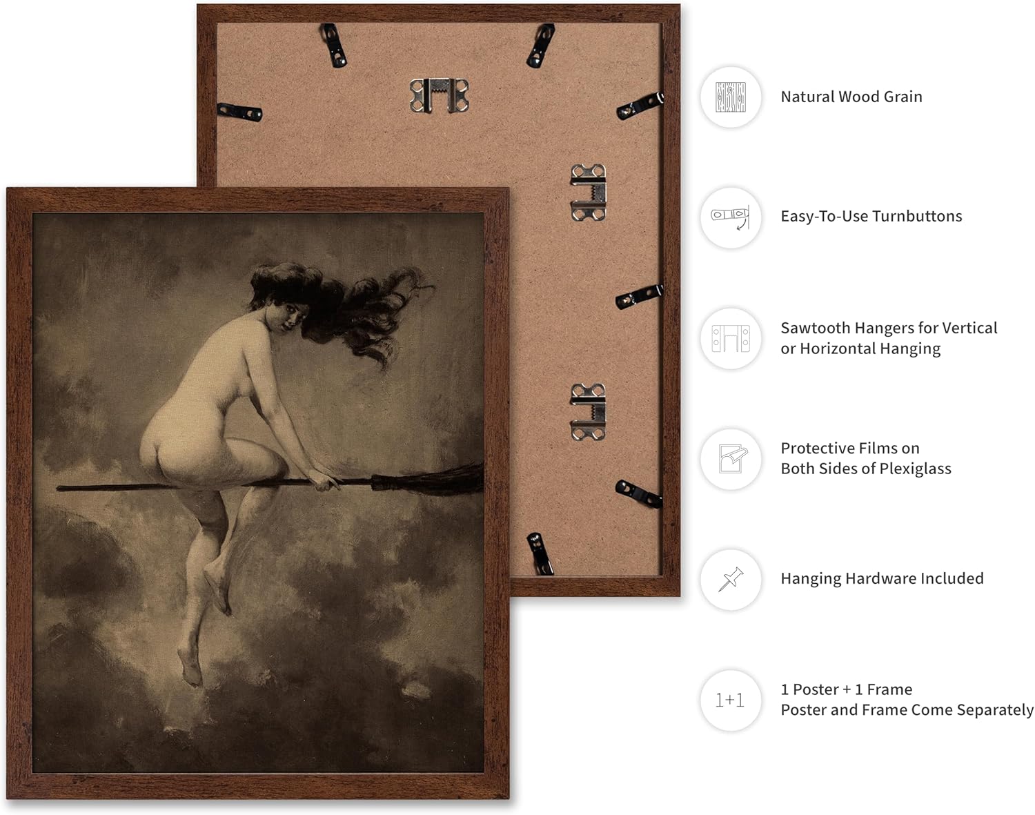 Poster Master Vintage Albert Joseph Penot Poster - Retro Halloween Print - Gift for Artist, Friend - Departure for the Sabbath, Naked Witch on Broom - Wall Decor for Bedroom, 8x10 Brown Framed