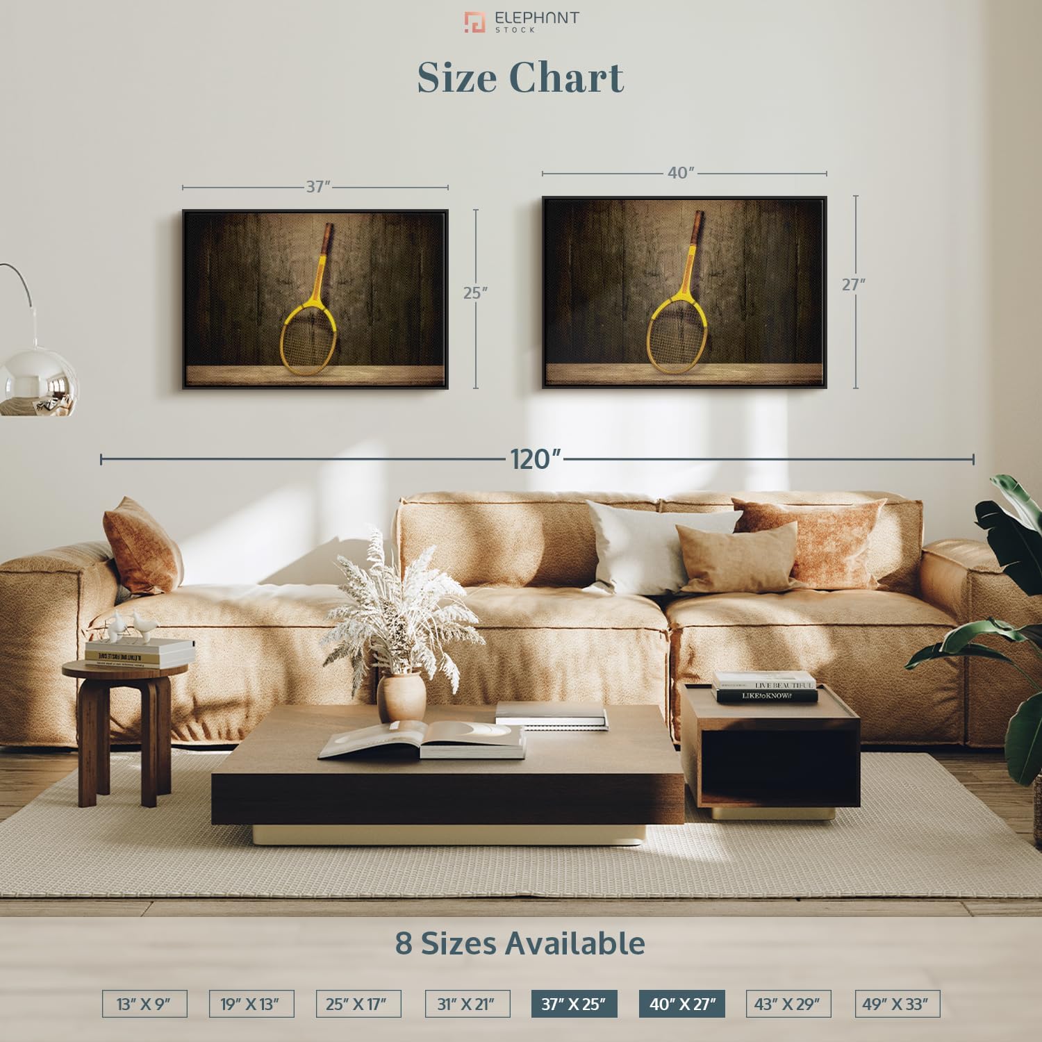 ElephantStock Vintage Tennis Racket Wall Art - Horizontal Framed Canvas - 1-Piece Living Room Wall Decor - Photography Sports Canvas Print - Brown and Black Decor for Wall - 40" X 27"