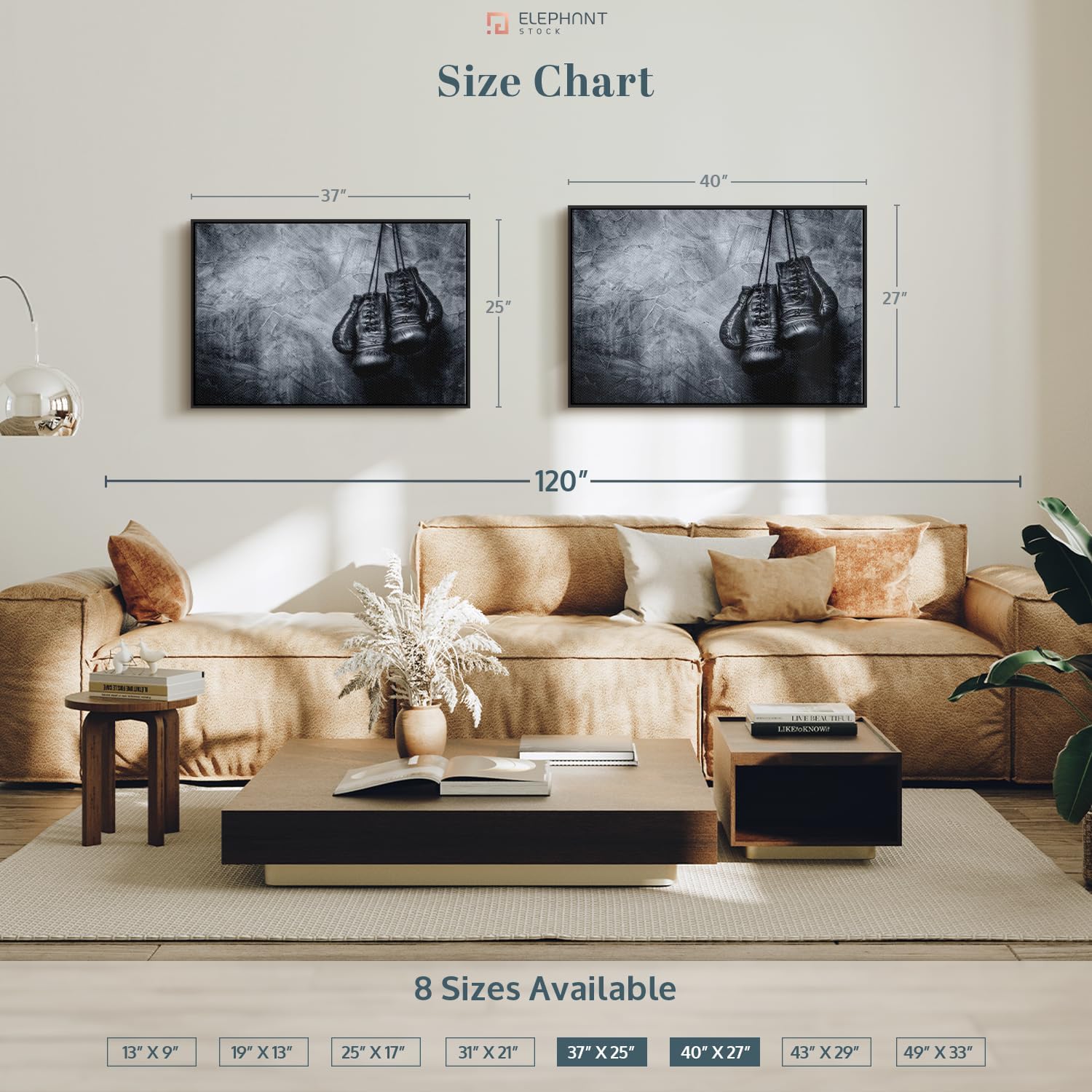 ElephantStock Boxing Gloves Wall Art - Horizontal Framed Canvas - 1-Piece Living Room Wall Decor - Photography Sports Canvas Print - Black and Gray Decor for Wall - 40" X 27"