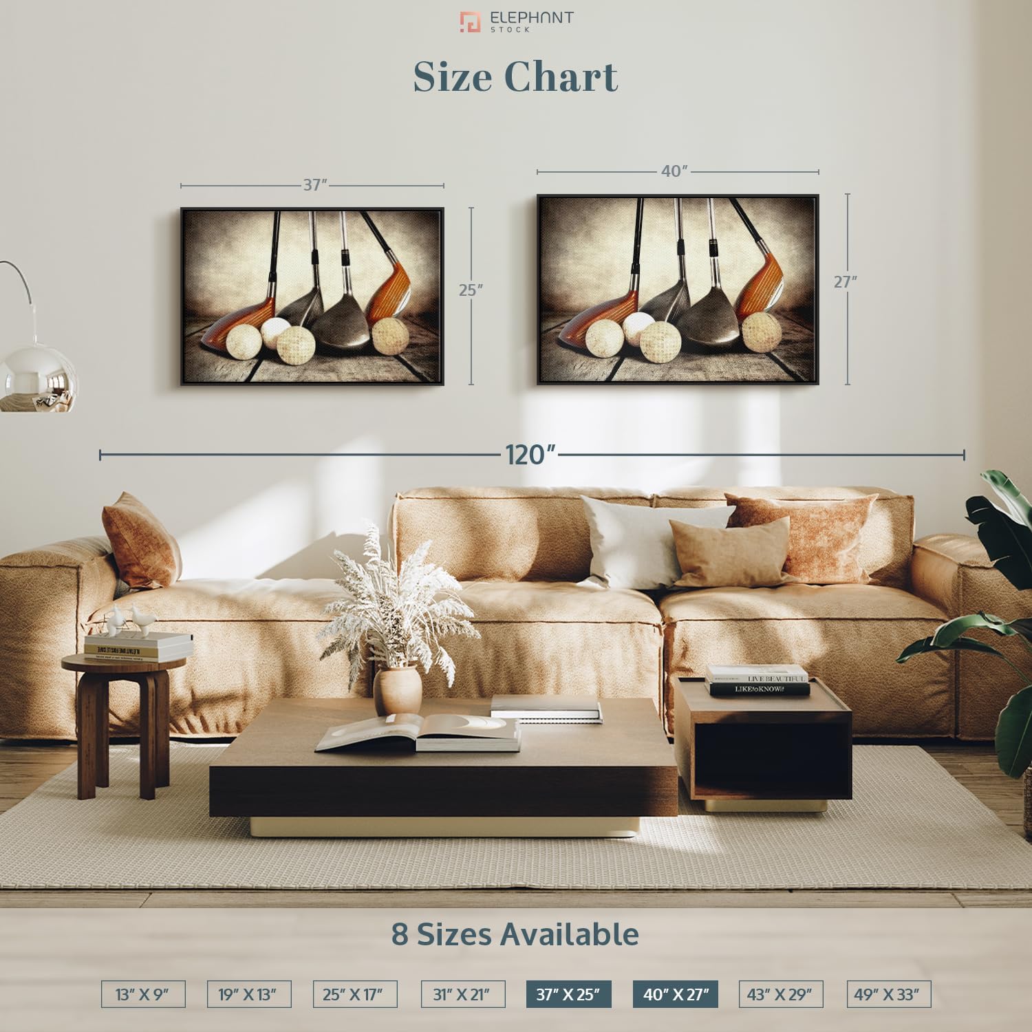 Elephant Stock Golf Sets Wall Art - Horizontal Framed Canvas - 1-Piece Mancave Wall Decor - Photography Sports Canvas Print - Yellow and Brown Decor for Wall - 37" X 25"