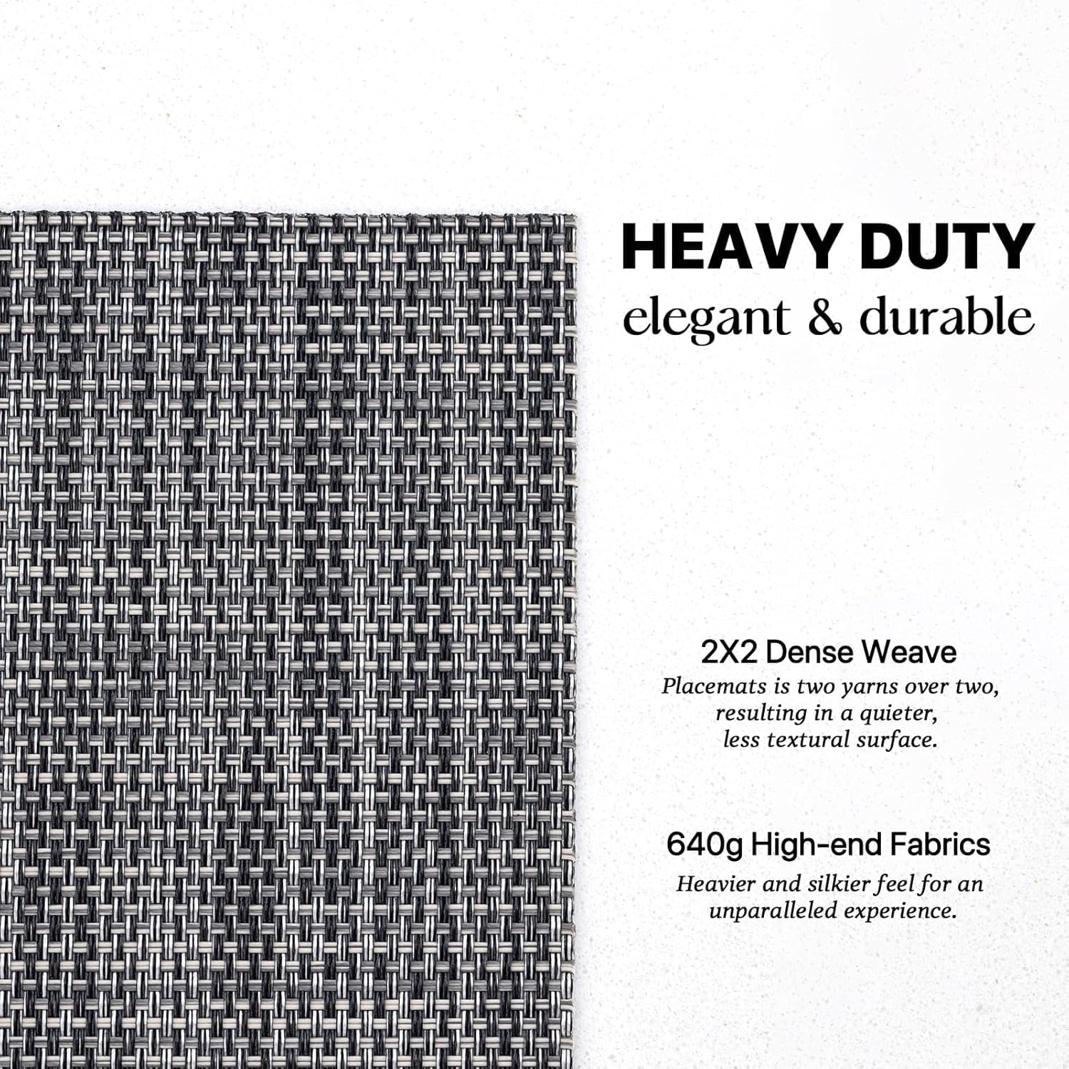 - HEAVY-DUTY:We uses the German-imported higher grammage vinyl material (Specialty PVC)than other placemats on the market,plus the precise,dense weave craftsmanship to give the woven placemats a thicker feel and make the place mats long-lasting.