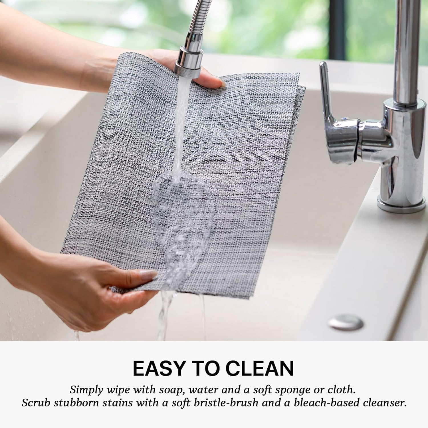- EASY TO CLEAN:The washable placemats can be washed repeatedly.How to clean the place mats for kitchen table:Simply wipe with soap,water and a soft sponge or cloth.Scrub stubborn stains with a soft bristle-brush and a bleach-based cleanse.