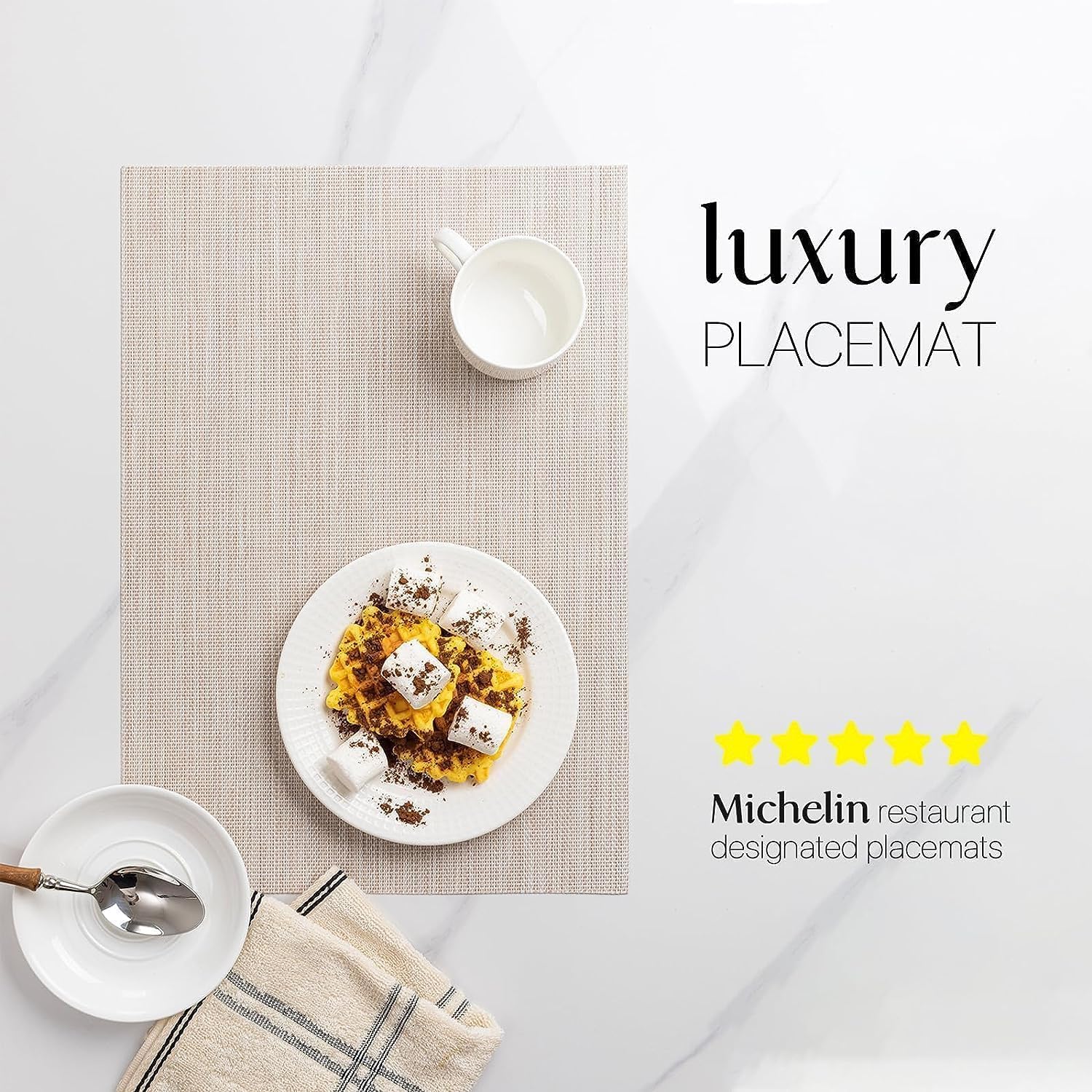 - PERFECT FOR INDOOR AND OUTDOOR:The wipeable placemat is two yarns over two, resulting in a quieter,less textural surface.The neutral color scheme and the classic size (about 12*17 inch)makes the whole table elegant and stylish full of texture!