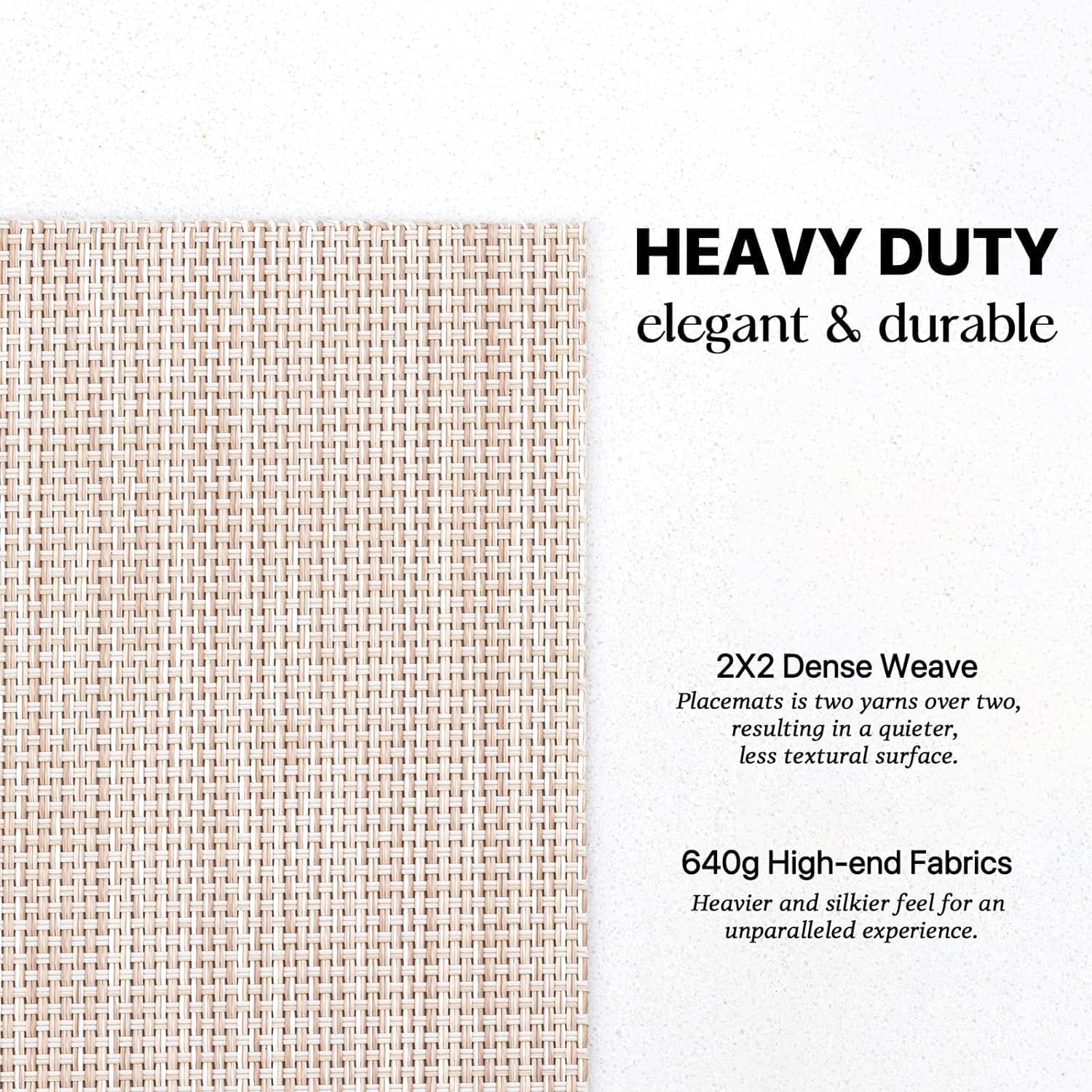 - HEAVY-DUTY:We uses the German-imported higher grammage vinyl material (Specialty PVC)than other placemats on the market,plus the precise,dense weave craftsmanship to give the woven placemats a thicker feel and make the place mats long-lasting.
