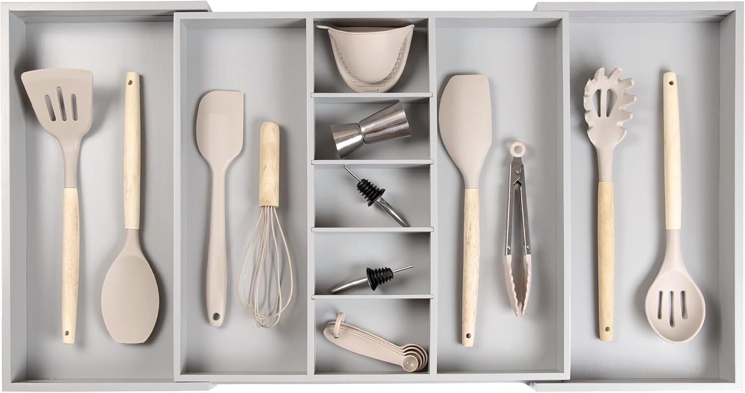 - OPTIMIZE YOUR DRAWER'S STORAGE POTENTIAL - While many drawer dividers stretch to just 22β in width, our organizer can extend up to an impressive 33β wide. This expandability guarantees that you can make the most of your kitchen drawer space.
