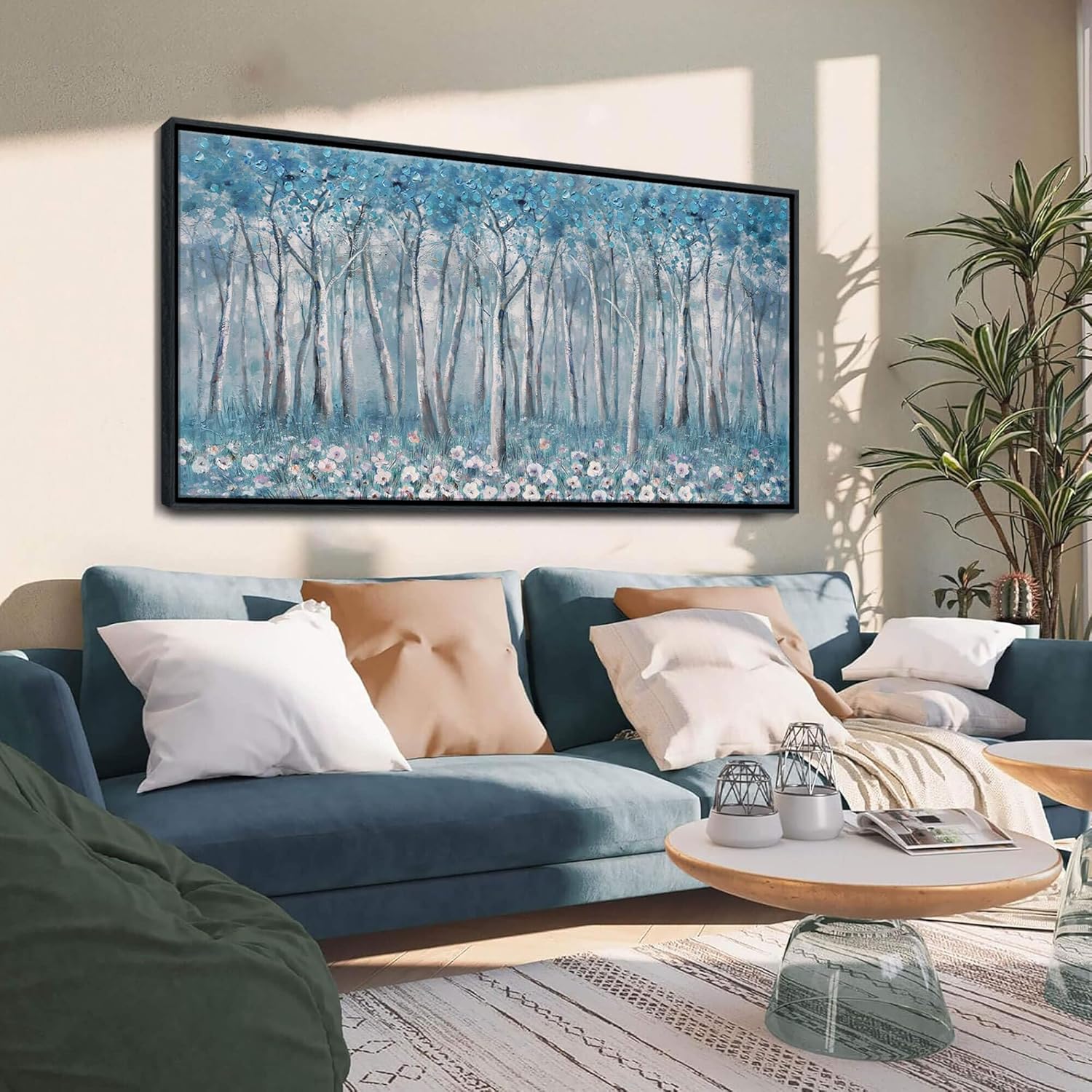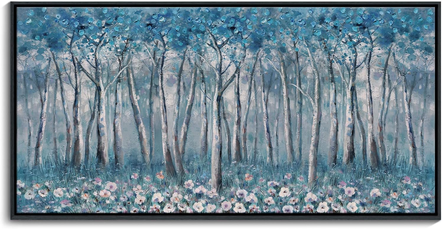 DUNHUANG ART Blue Tree Canvas Wall Art - Large Size Teal Abstract Painting for Home Office Living Room Bedroom Bathroom - Black Framed - Wall Decor Living Room 20"x40"