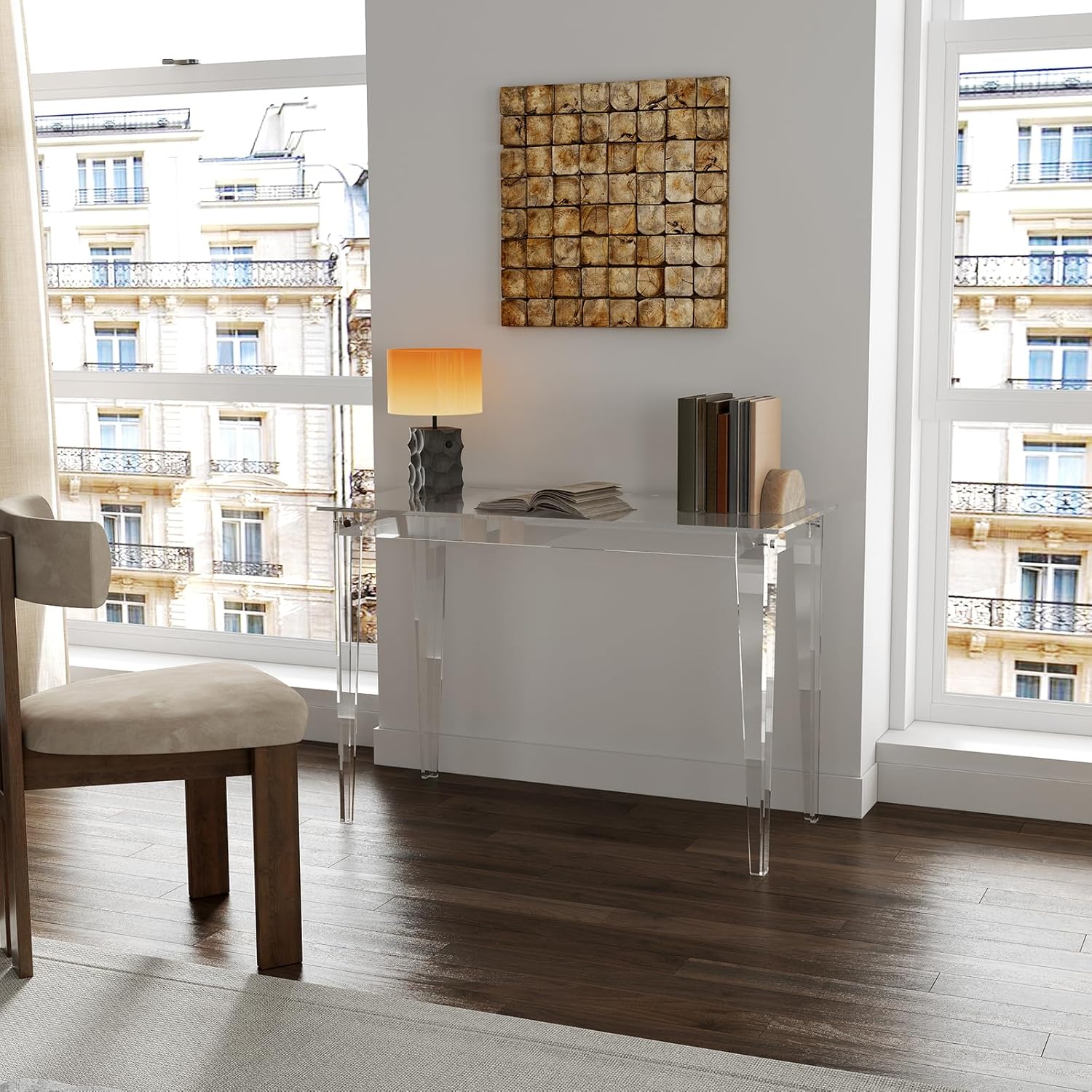 - Minimalist Style: Transparent acrylic desk with Right-Angle legs, simple & modern. Its unique design elements add a sense of modernity and sophistication into your living space. Round corner design and smooth edges, safety for use, especially for families with children.