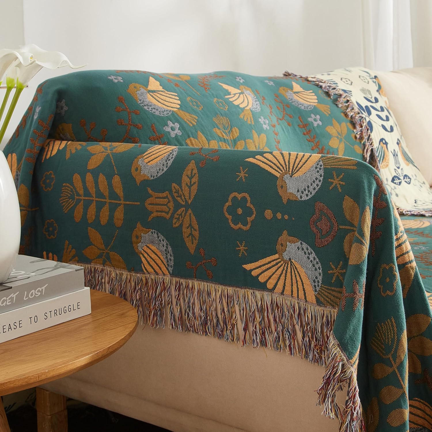 Boho Throw Blanket for Bed 90”x98”, 100% Cotton Woven Blanket for Couch Sofa, Ultra Soft 4-Layer Muslin Quilt with Bird Floral Printed, Farmhouse Bed Blanket/Cover for Living Room Decor