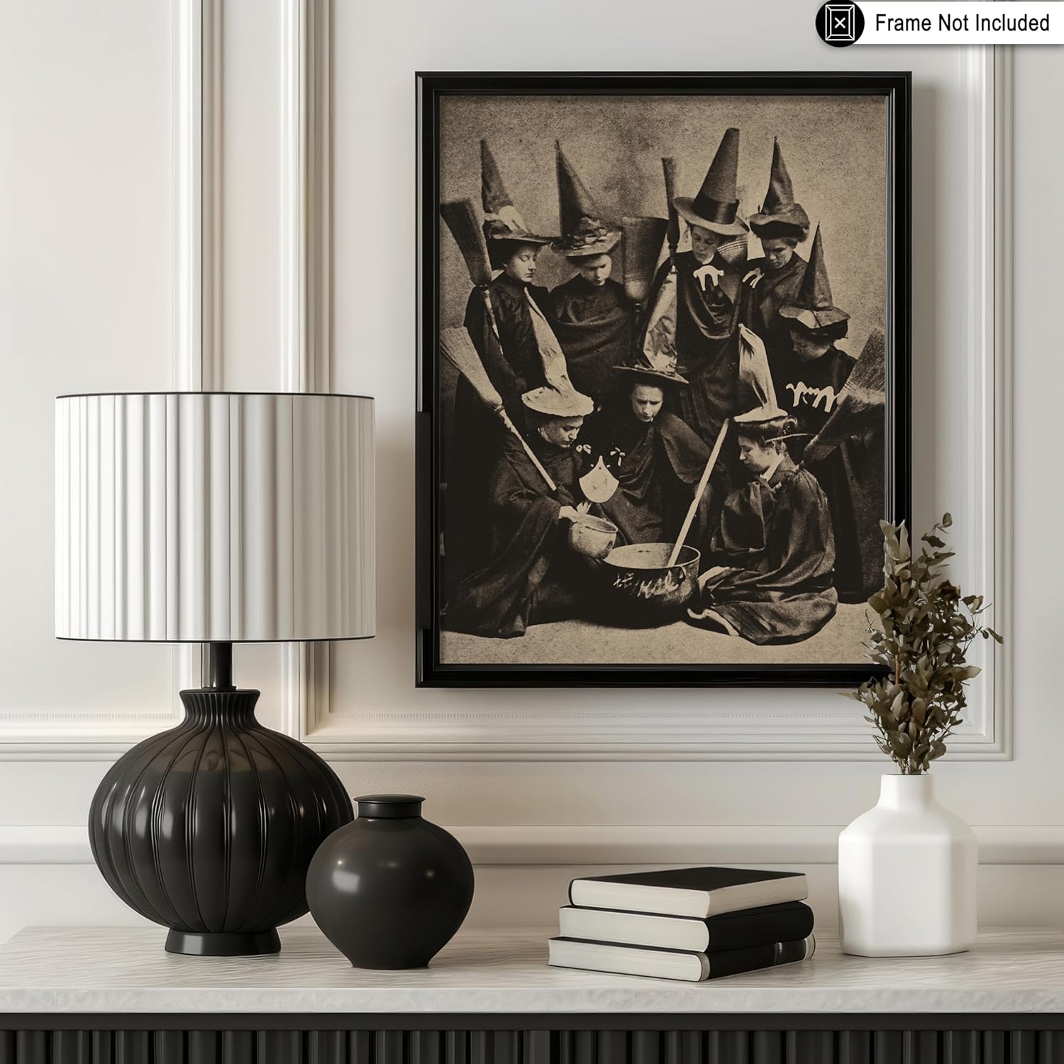 Poster Master Vintage Photograph Poster - Retro Halloween Print - Gift for Artist, Friend - Witches Cooking, Pointy Hats, Broomsticks, Black Magic - Wall Decor for Bedroom, 18x24 Unframed Wall Art