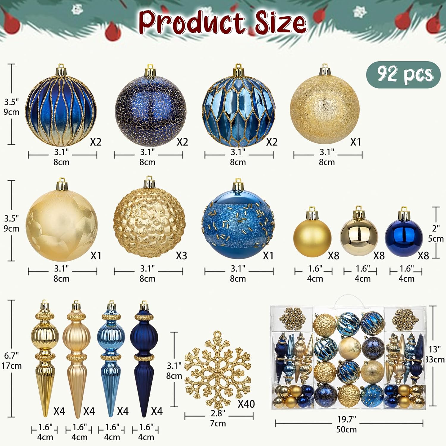 - COMPLETE 92-PIECE SET β Each Christmas ornament set includes 92 carefully selected pieces in various sizes and designs, including classic round balls, intricate finials, glittery snowflakes, and mini baubles. This complete collection allows you to decorate your entire Christmas tree with a perfectly coordinated look