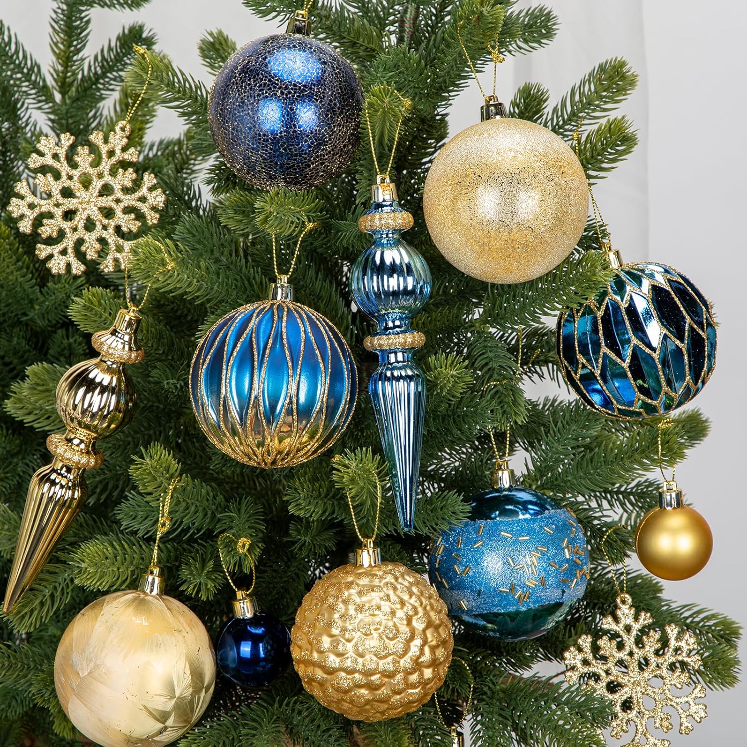 92ct Christmas Tree Decoration Set Christmas Ball Ornaments with Srtings Shatterproof Christmas Baubles for Christmas Holiday Wreath Garland Party Decoration, Blue-Gold