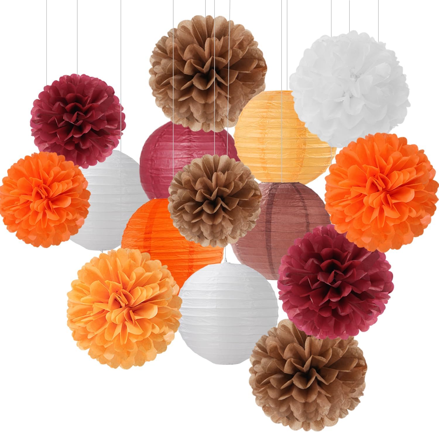 - 【Brown Burgundy Orange Party Decorations Kit Includes】The party decorations kits include 9pcs tissue paper flowers: 6pcs 10" and 3pcs 8" in brown burgundy orange color, 6pcs 8inch paper lanterns.