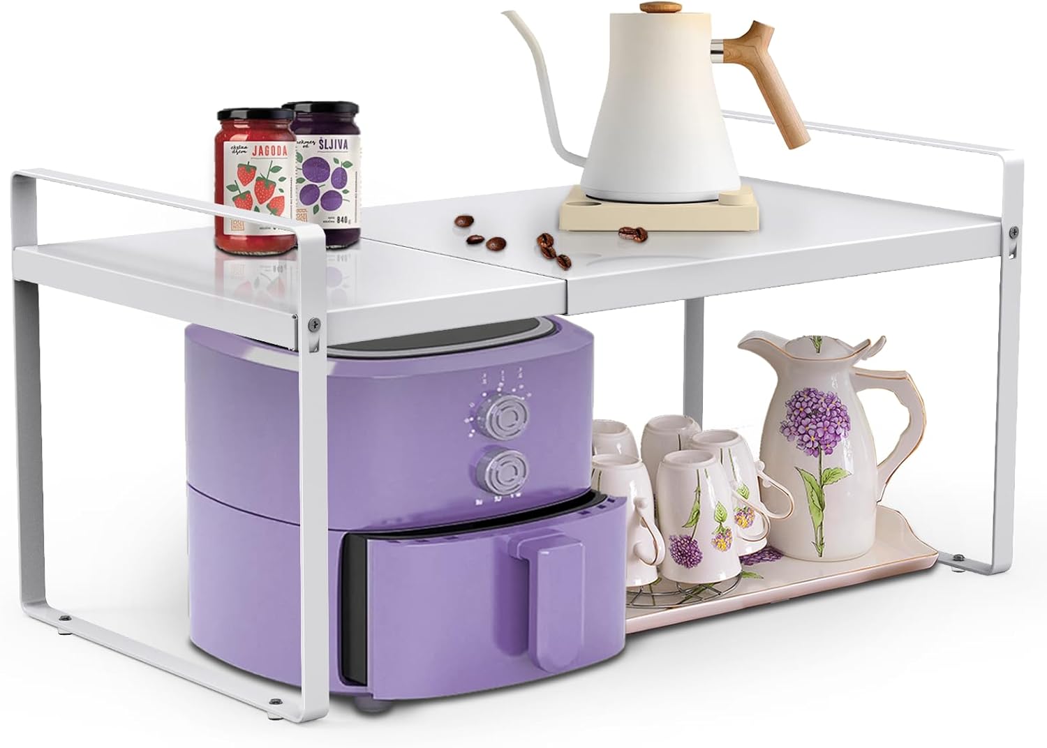 - Expandable:Use our expandable cabinet shelf organizer rack,you may expand the length of this freestanding cabinet shelf to your desires. Kitchen counter storage shelves stand can easily adjusted from 14 inches to 26 inches in length depending on how you want to organize your space. Specification:14 to 26 * 10 * 9 inches.The smooth surface of this cabinet shelf has been polished so it is for lifetime of use and does not wear out easily. Helps to create space and make your home more stylish at the same time