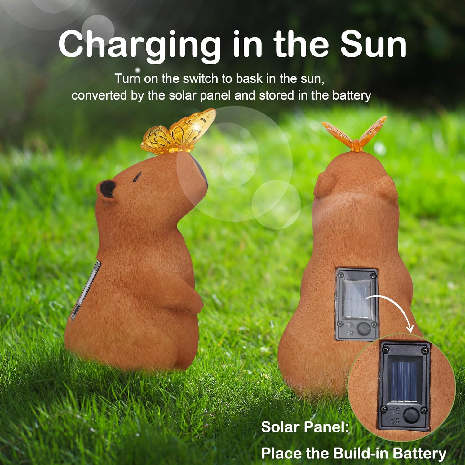 - 【ECO-Friendly & Easy to Use】Renewable and clean energy - Convert solar energy into electricity during the day. Switch the outdoor gray capybara decor to "ON", and the capybara figurine light will auto charge during the day, auto light up at night