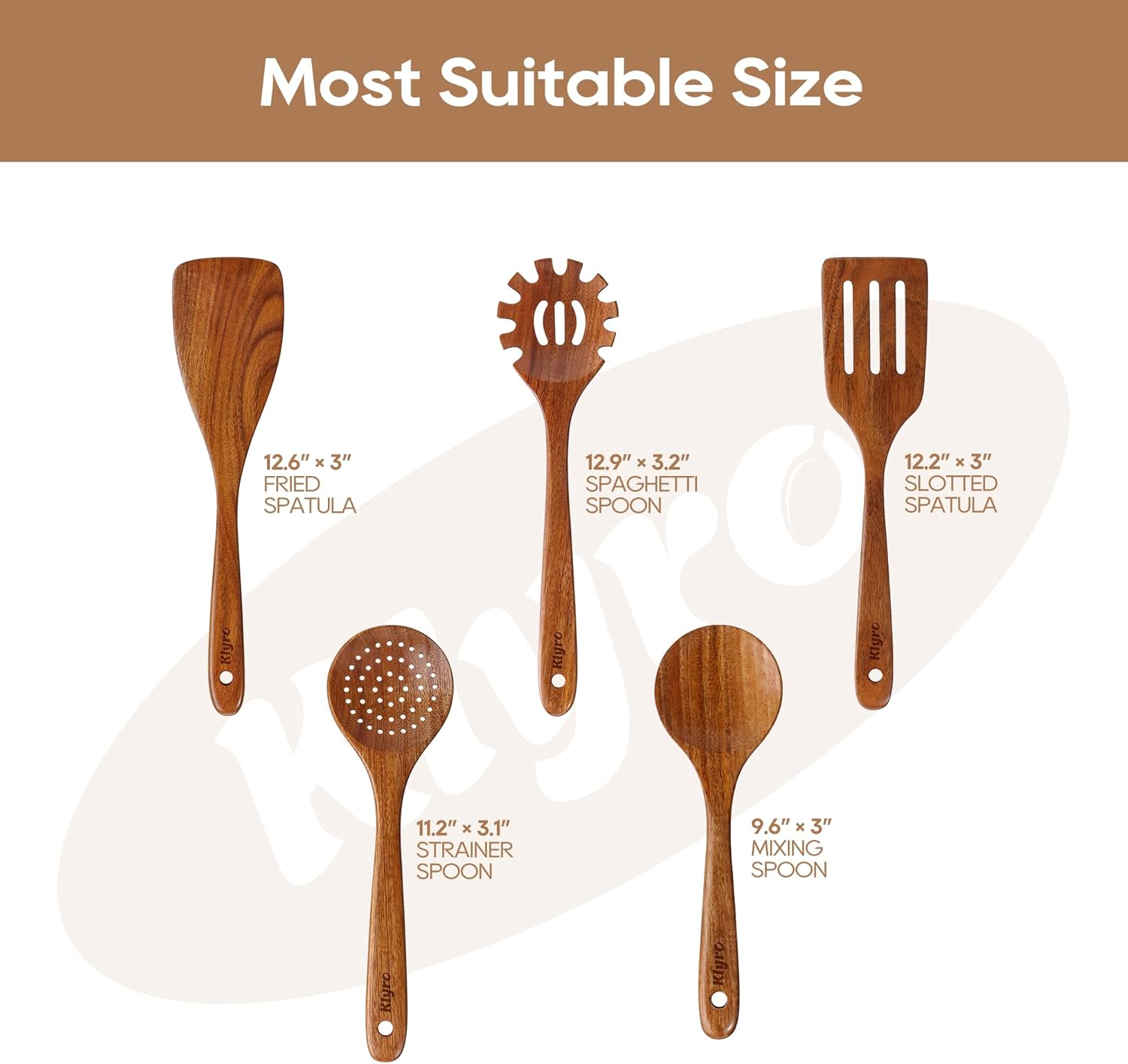 Teak Kitchen Utensils Set, 5 Piece Premium Wooden Cooking Utensils Set, Non-Stick Heat-Resistant Wooden Spoons for Cooking, New Apartment Essentials