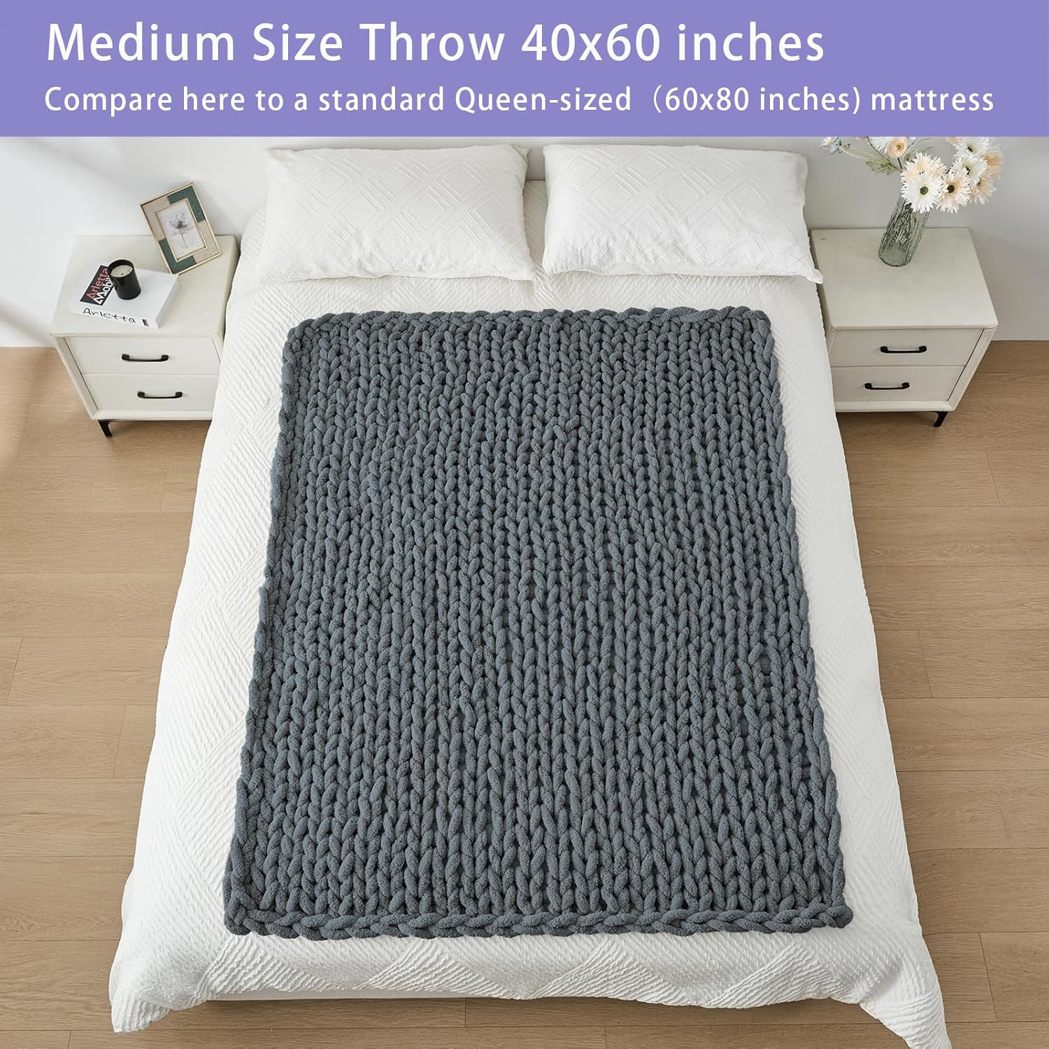 Bigacogo Chunky Knit Throw Blanket for Couch, 40x60 inches, 100% Hand Knitted with Thick Jumbo Chenille Yarn, Cozy Soft Large Rope Knot Cable Crochet Blankets for Sofa Bed Living Room, Iron Gray