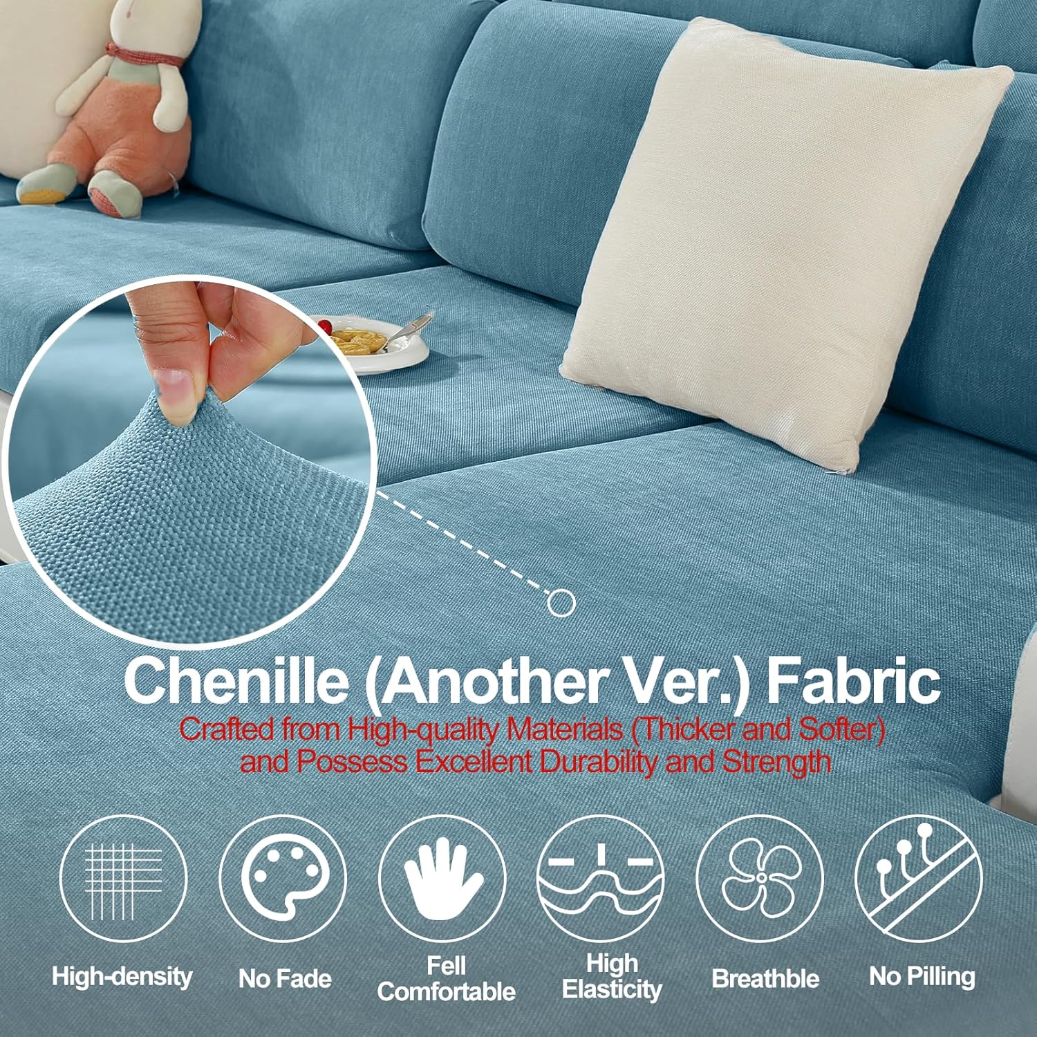 - 【Year-Round Use】Compared to other jacquard materials, the Chenille fabric chaise cushion cover features a simple and refreshing design without intricate patterns, making it highly resistant to aesthetic fatigue. Additionally, it boasts excellent breathability and comfort, making it ideal for year-round use. Whether it's summer or winter, this cover can keep your sofa feeling comfortable and fresh.