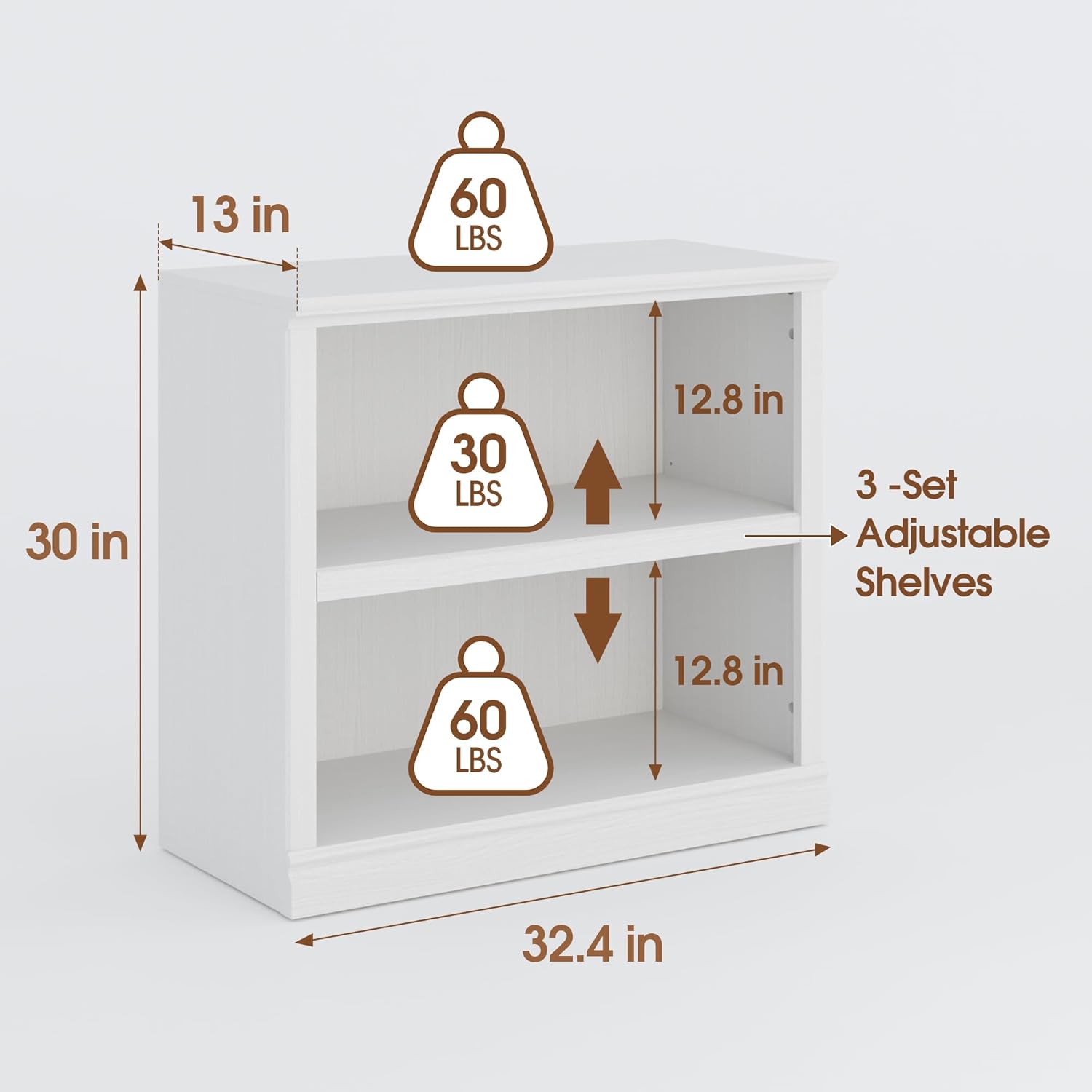 - Product Dimensions: A total bookcase is 13" Depth x 32.4" Width x 30" Height, each Layer is 12.8 inch height for you to storage.