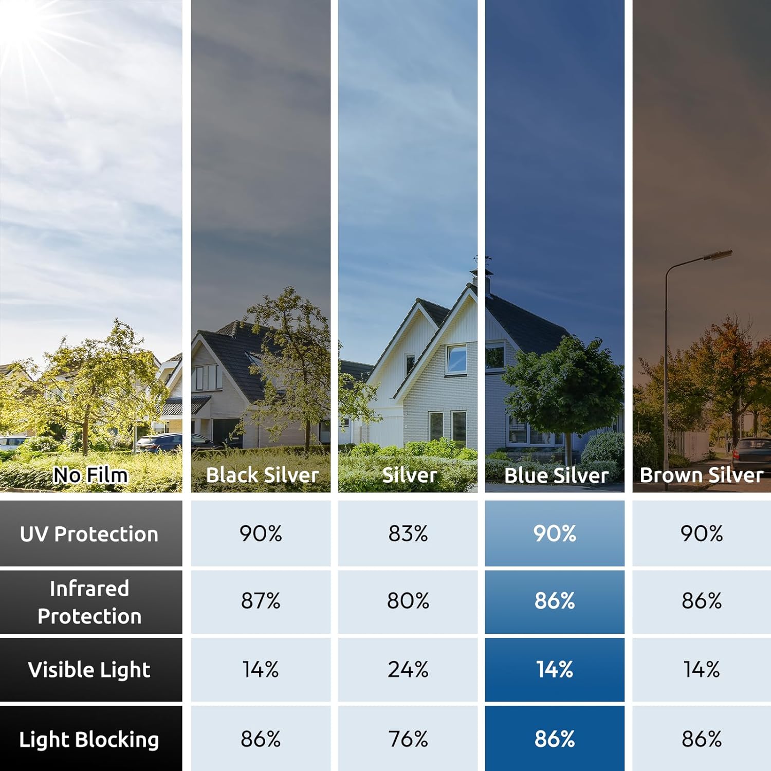 - UV Protection, Glare Reduction: Blocks up to 90% of UV rays, this window film heat blocking helps protect flooring, furniture, and draperies from fading. It also protects your eyes and skin from harmful UV rays. With 14% VLT, it effectively reduces glare while allowing some visible light in, creating a comfortable indoor environment
