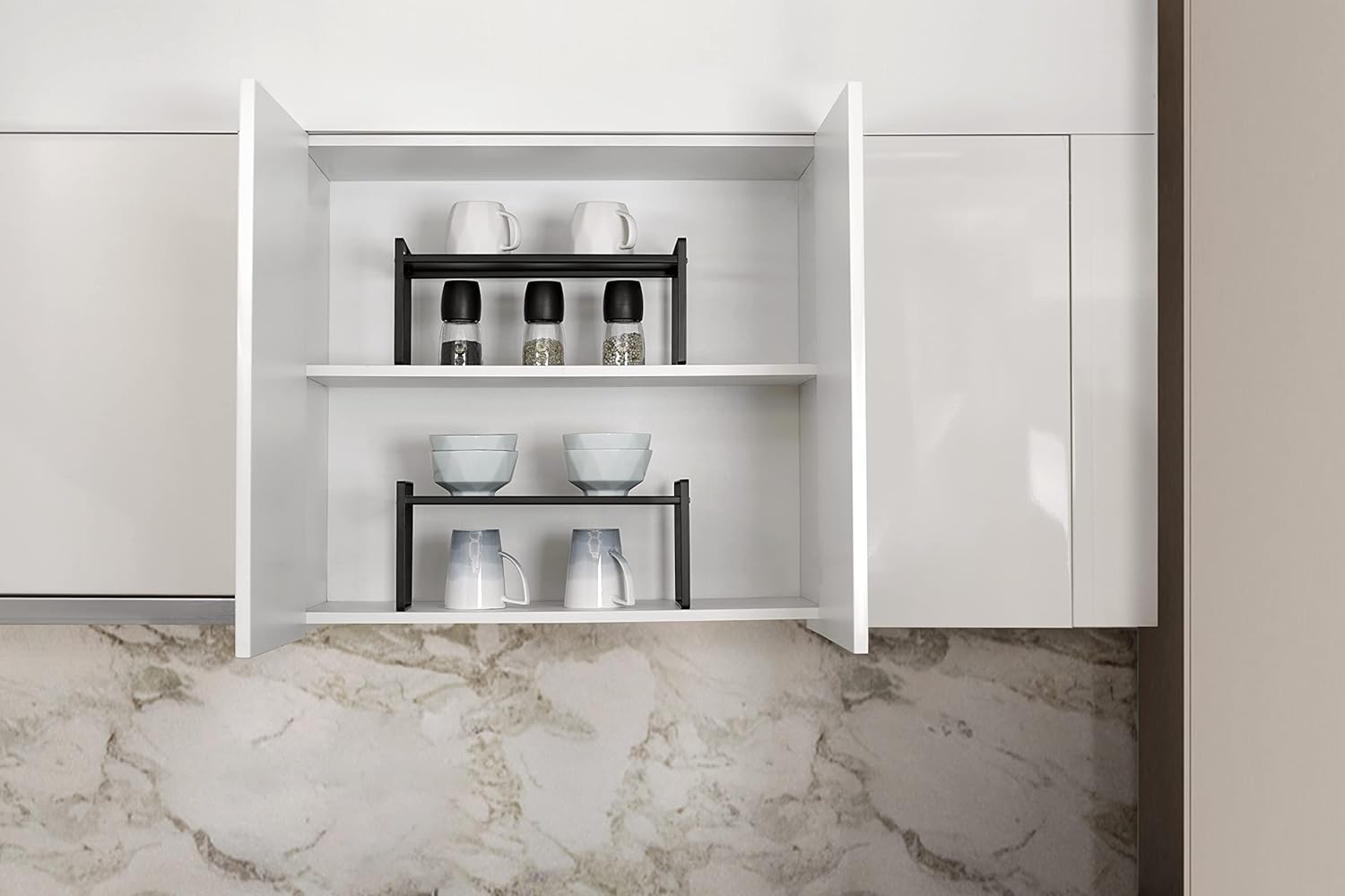- STACKABLE: The product comes with two sets of cabinet shelves where you can stack one on top of another, creating 2-tiers double space to store household items under, in between or on the shelf. They are perfect to use as storage organizers in kitchen, cabinet, pantry, cupboard, and anywhere in your home or office for that wonderful extra storage space.