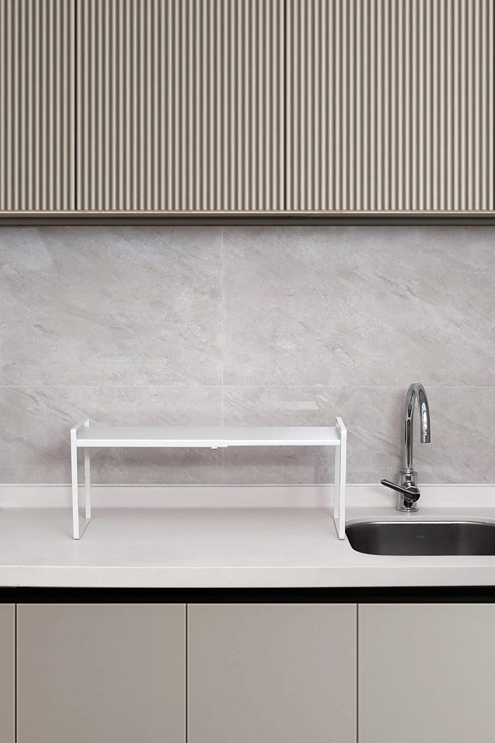 - EXPANDABLE: You may expand the width of this freestanding cabinet shelf to your desires. It can easily vary from 13.4 inches to 24.5 inches in width depending on how you want to organize your space. Specification: 12’’D * 13.4-24.5’’W * 9.5’’H
