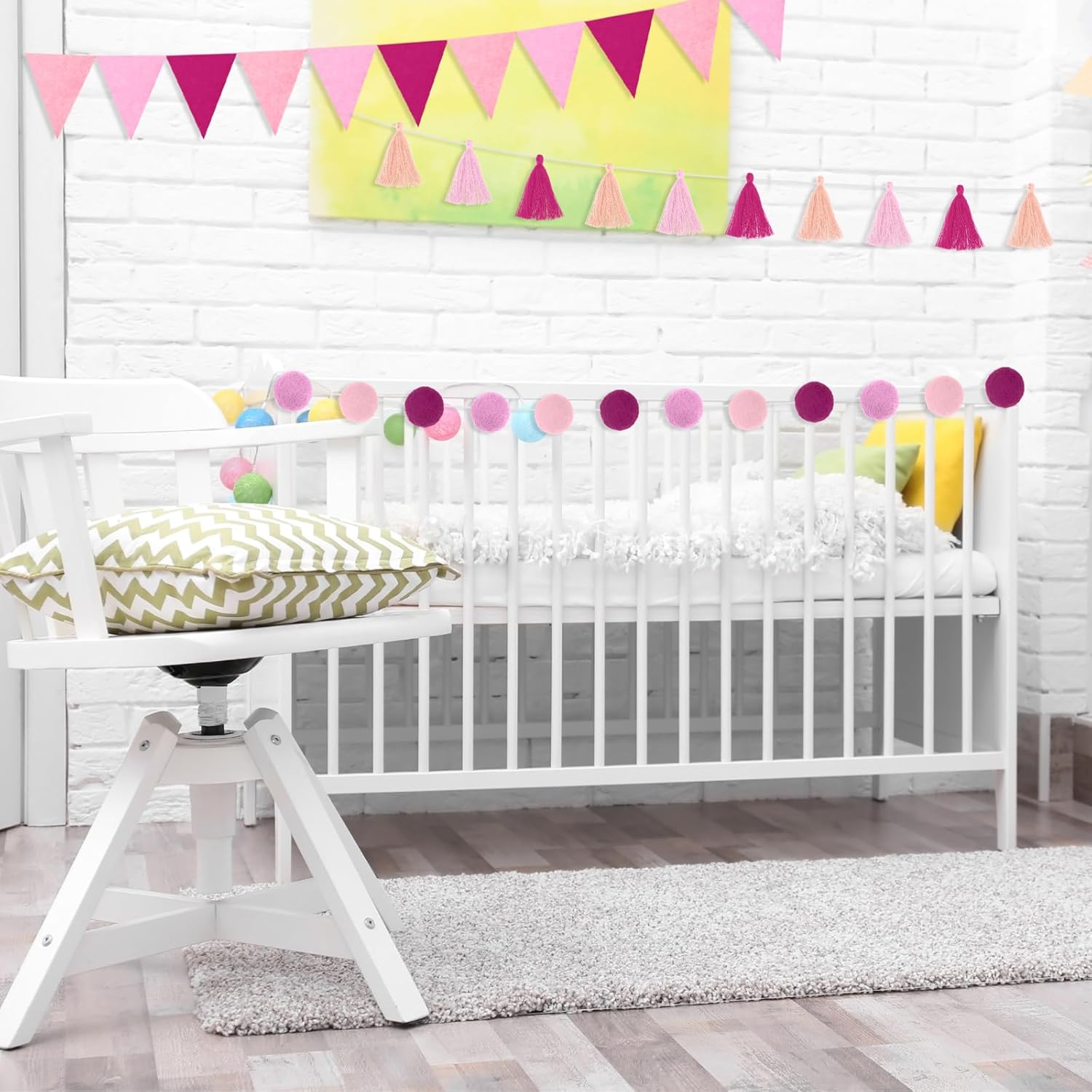 - Nice Decoration Set: the pom pom garland looks elegant and cute when hung on the wall or as backdrop decorations, easy to hang on the ceilings, walls as party or home decoration; Each garland consists of 10 pieces of tassels and each tassel contains 3 different pink colors, full of warm and sweet feelings; The pennant banner cutting is neat, will not easily fall off or break, durable and reusable