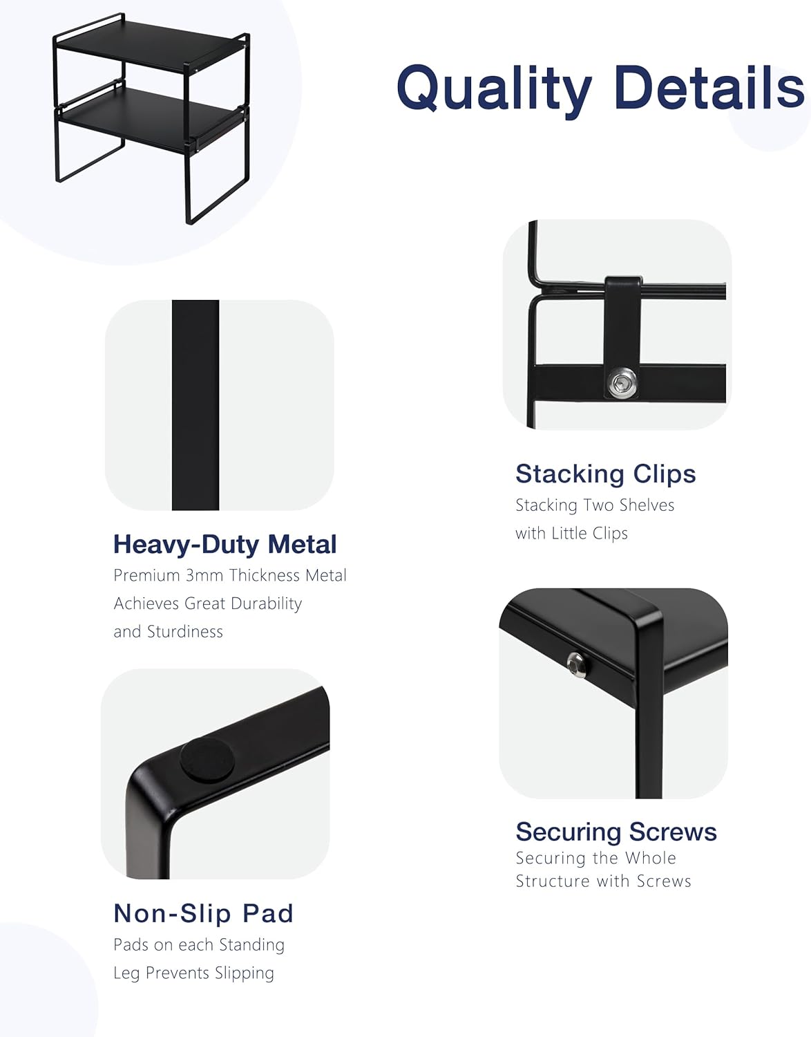 - STACKABLE: The product comes with two sets of cabinet shelves where you can stack one on top of another, creating 2-tiers double space to store household items under, in between or on the shelf. They are perfect to use as storage organizers in kitchen, cabinet, pantry, cupboard, and anywhere in your home or office for that wonderful extra storage space.