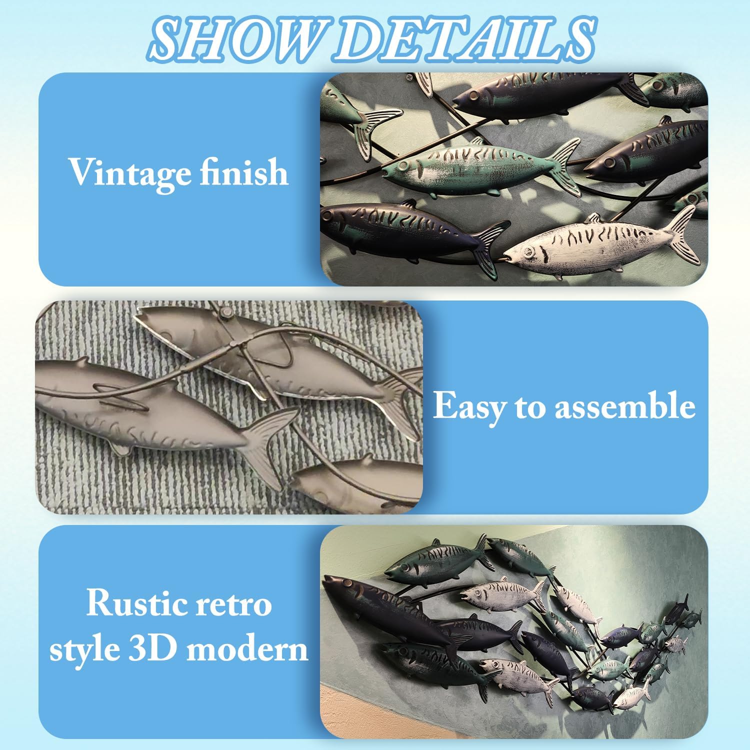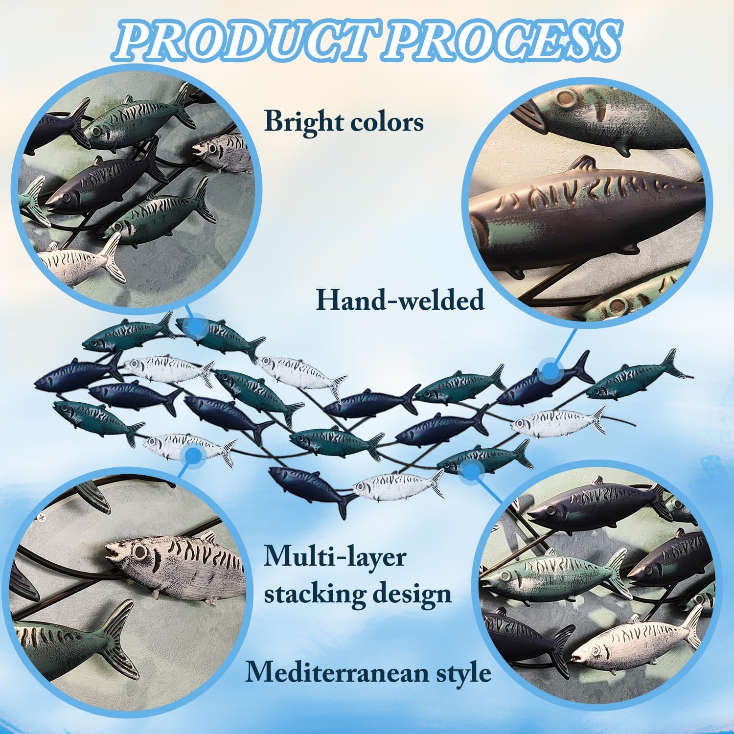 - Metal Fish Wall Decor : 20 lifelike fish frolicking in the water, handmade metal iron crafts, Hand painted old-fashioned fish decoration with a Mediterranean-style marine theme, Smart and elegant, lifelike, retro distressed finish. Large Size 59" x 16"(150 x 40cm).