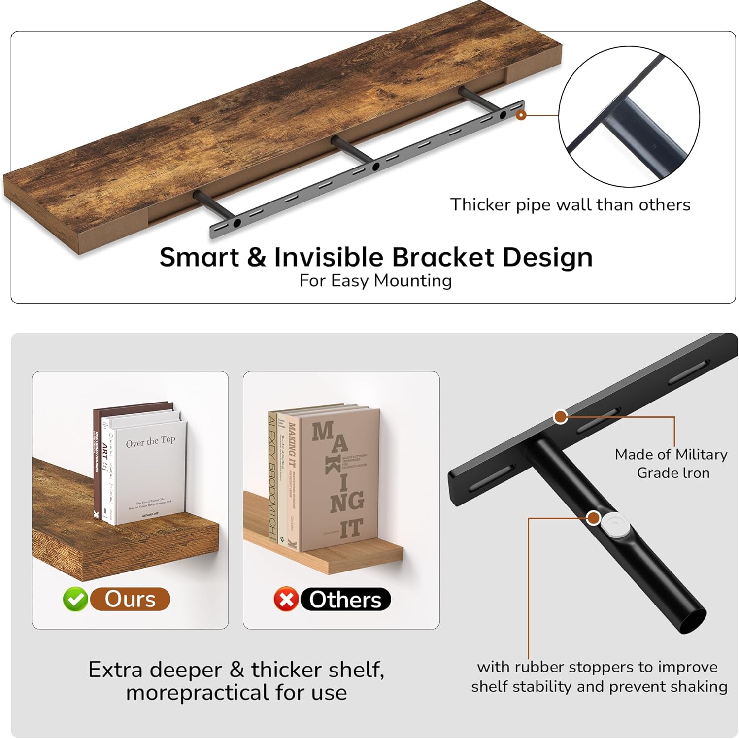 - Extra Deeper & Thicker - This wall shelf measures 48"W x 10.23"D x 1.8"H. Extra deeper and thicker design in order to bring maximizes storage space and weight capacity, even hold up to 75 lb. This floating shelf taking up zero square feet, reduces clutter and highlights dรฉcor in compact spaces.