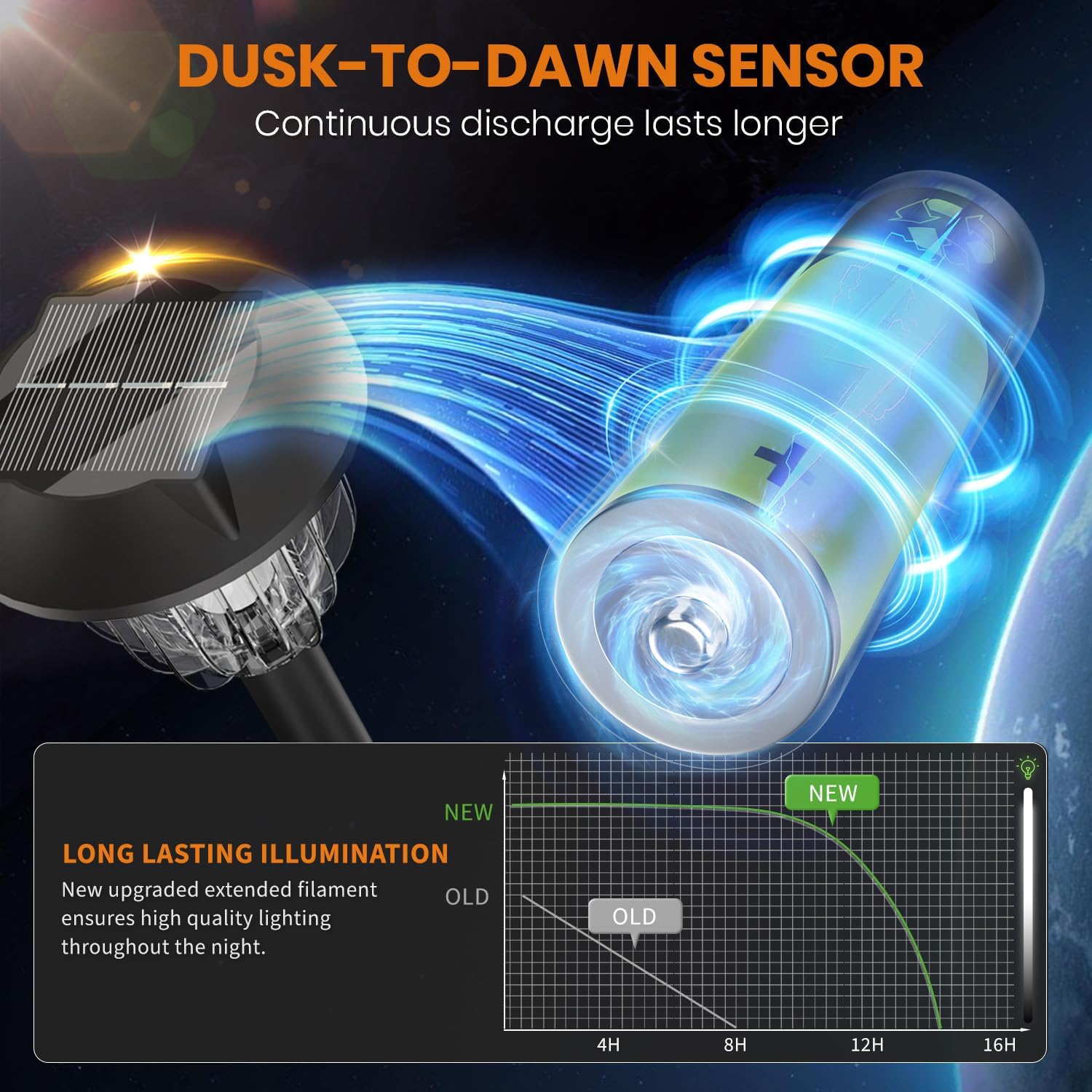 - DUSK TO DAWN LIGHT UP LANDSCAPE LIGHTING: Solar power lights automatically turn on at night and turn off at dawn which enables led pathway light conserves battery life for when itβs needed most. The lights provide a good amount of illumination after a sunny day.