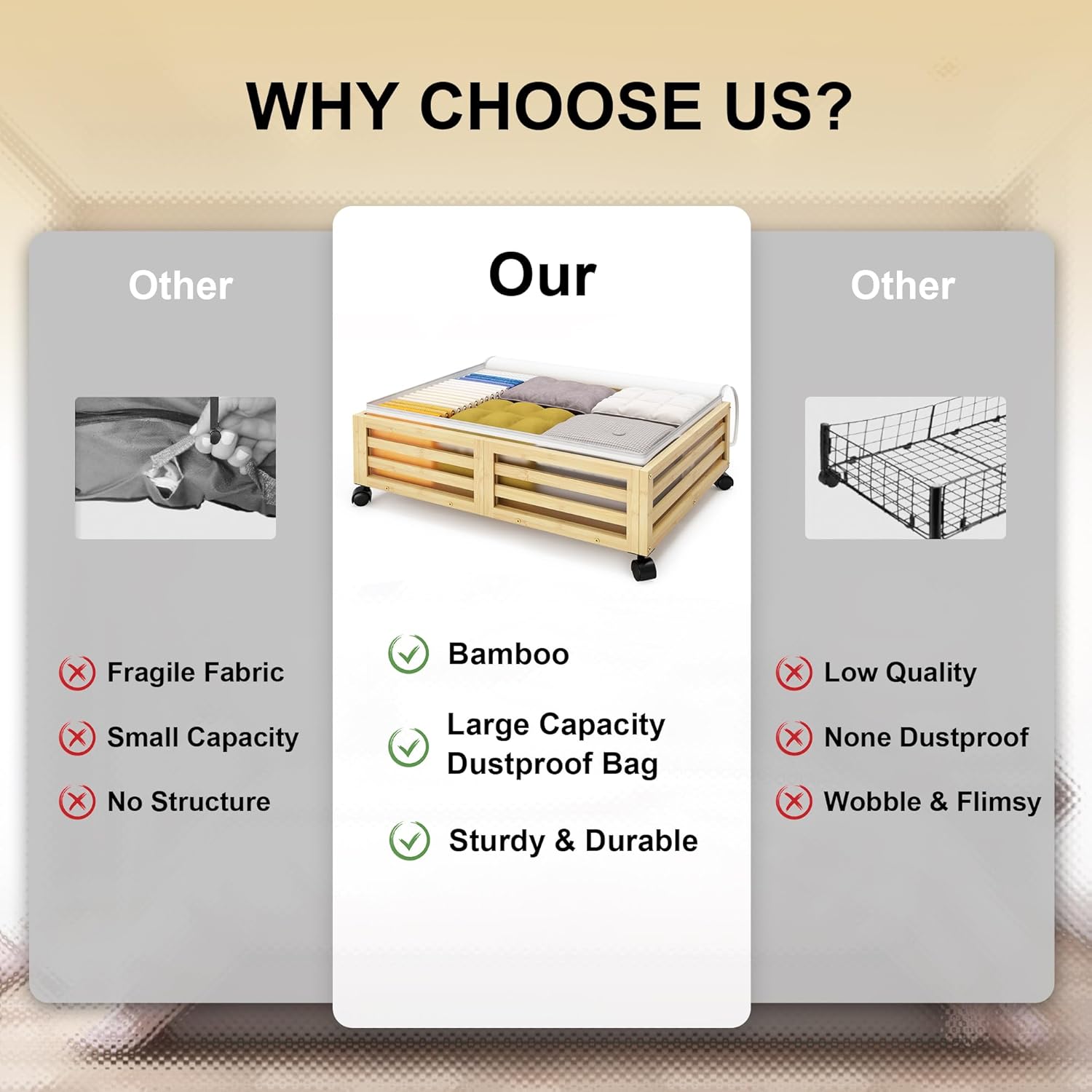 - ✅【Sturdy Under Bed Storage】:Our underbed storage units are built to last with high-quality 100% Real Bamboo,Beautiful appearance compared,oasting 4 rotating wheels with capacity of 120lbs, 48L large capacity dustproof cover bags hile the load-bearing capacity and durability are dramatically increased ,It's a versatile storage solution that can be customized based on your needs.