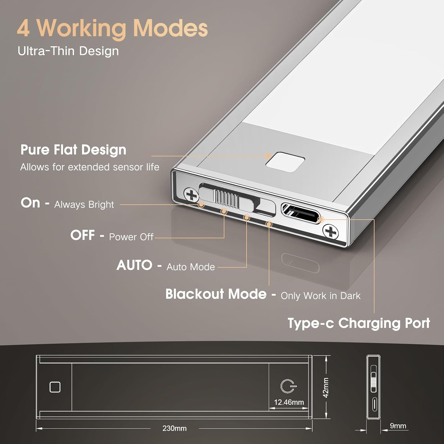- [New Motion Sensor & long-Lasting Use]: The latest flat sensor design extends the life of the motion sensor light, it can sense and light up within 10ft and 120Β° of the lamp. With 1800mAh rechargeable battery inside, after fully charging, this kitchen cabinet lights last up to 3-5 hours under ON mode and almost 1 month under NIGHT mode. No more Extra AA/AAA Battery. Energy Save & Save More Money!