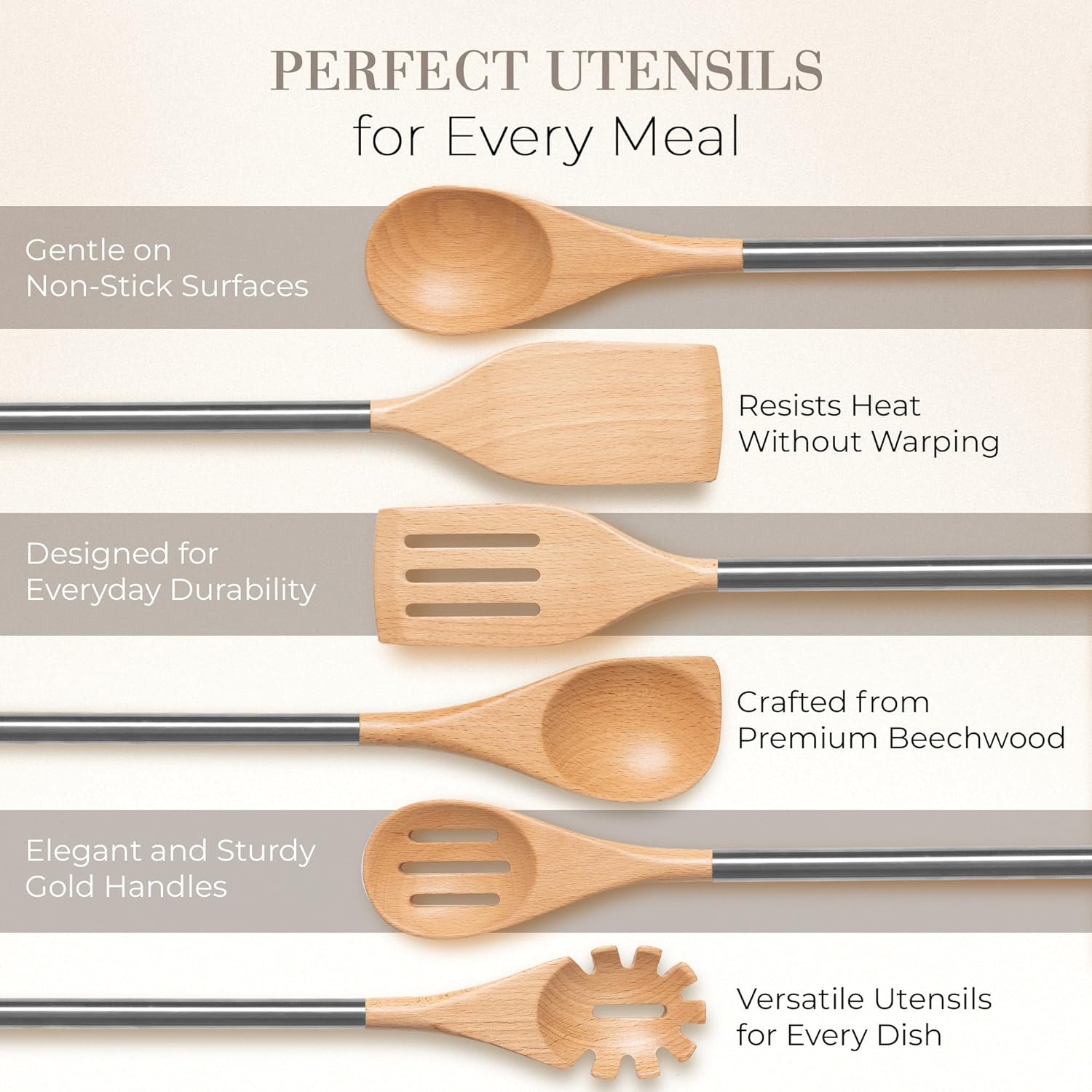 - BUILT TO IMPRESS, MADE TO LAST —Crafted from 100% beechwood with durable stainless steel handles, these wooden utensils for cooking are the perfect combination of elegance and durability. No cracks, no melting—just reliable tools that can take the heat. Plus, the natural wood grain adds a one-of-a-kind charm, making this wooden cooking utensils set as unique as your culinary creations.