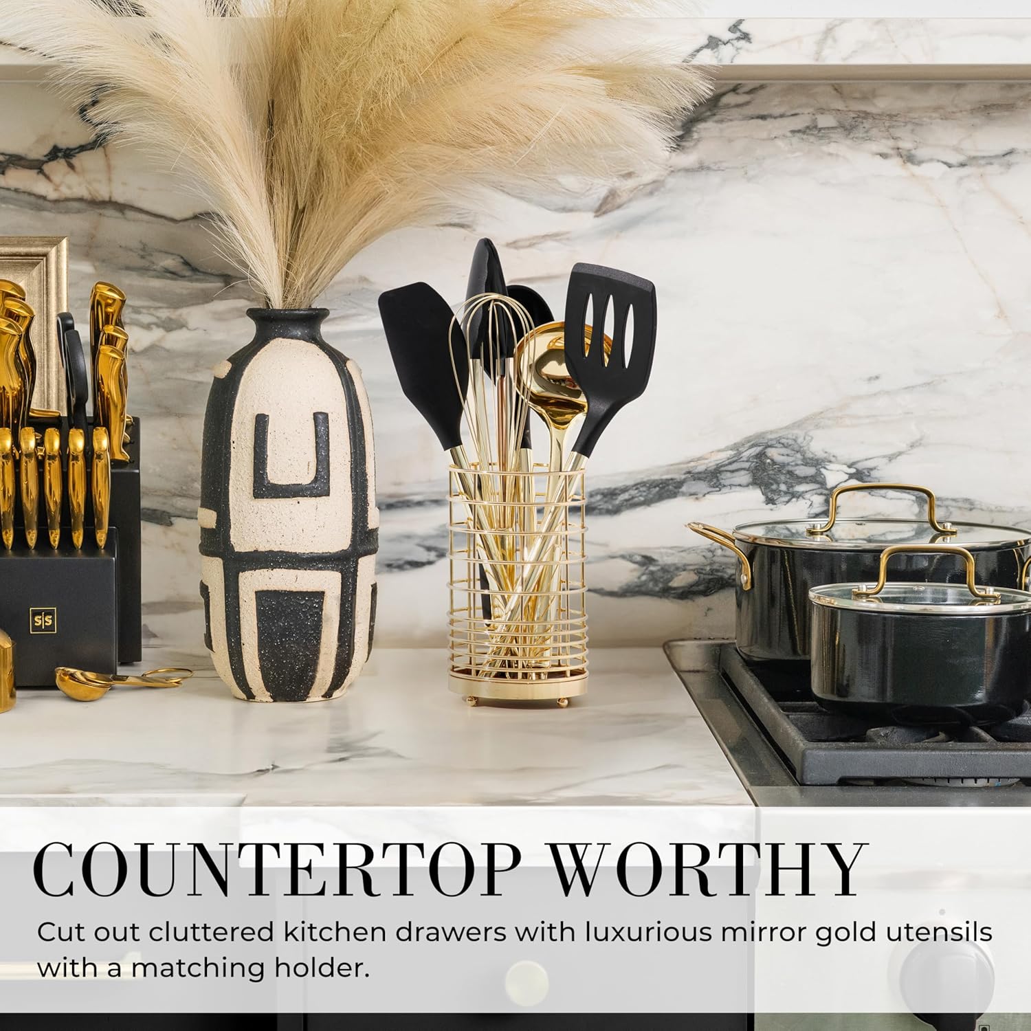 - BUILT TO LAST (AND TO IMPRESS) – No more scratched pans or melting tools! Our durable gold kitchen utensils are designed to be gentle on nonstick surfaces while standing up to high heat. This black and gold utensil set protects your cookware and makes every meal a masterpiece. And with a sleek matching holder, your countertops will be more organized (and glamorous) than ever. Get ready to show off your new black and gold utensils!