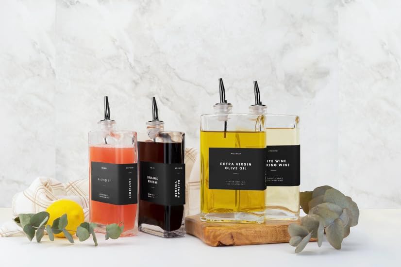 - Modern Kitchen Essential: Minimalism Inspired Cooking Oil Dispenser Bottle. This Set Includes Two High-quality 11.8 Oz (350 Ml) Glass Bottles, Two Gold Pourers, a funnel, and a 37 Label Set.