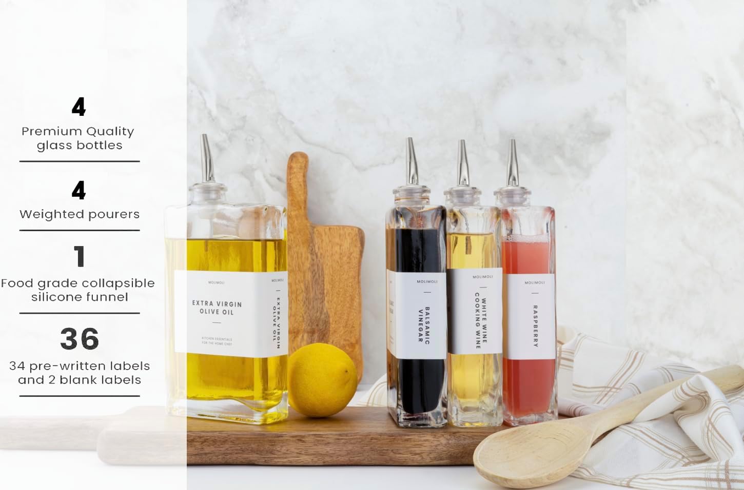 - Modern Kitchen Essential: Minimalism Inspired Cooking Oil Dispenser Bottle. This Set Includes Two High-quality 11.8 Oz (350 Ml) Glass Bottles, Two Gold Pourers, a funnel, and a 37 Label Set.