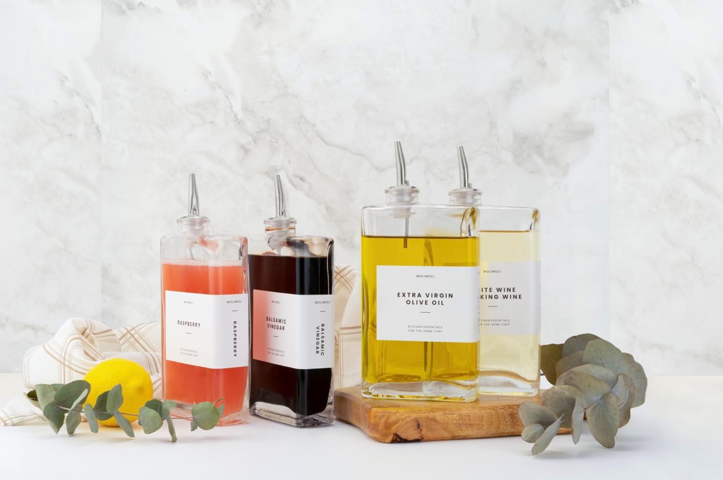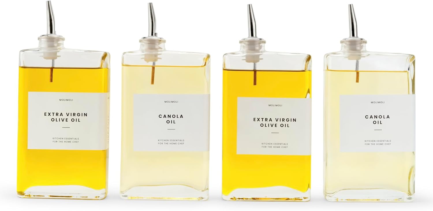 Molimoli Olive Oil Dispenser Bottle for Kitchen, Automatic Pourer, Glass Dispenser for Kitchen, Olive Oil Cruet, | Set of 4 - Silver