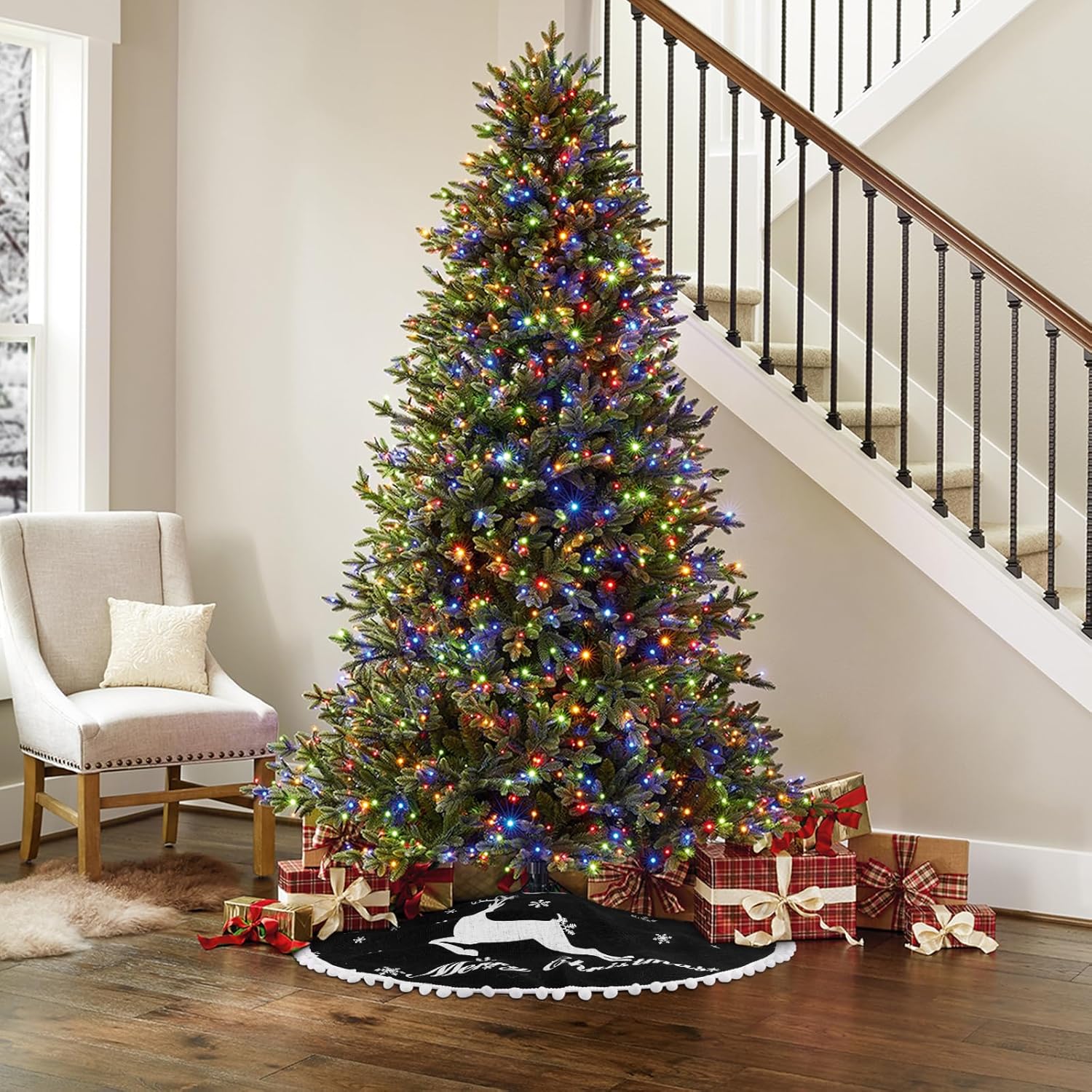- Merry Christmas Tree Skirt:Our Christmas tree skirts is printed with elk and various sizes of snow patterns, as well as the words "Merry Christmas." The edges are adorned with small, fluffy balls, adding a festive touch to your Christmas tree. This 24-inch tree skirt is perfectly sized for most Christmas trees perfectly. Before making a purchase, please measure the diameter of your tree to ensure a perfect fit