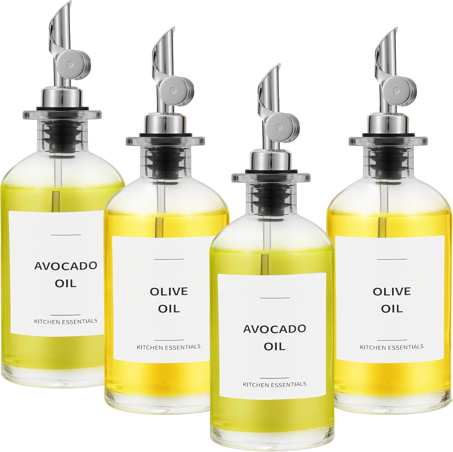 Olive Oil Dispenser Bottle - Includes 55 Kitchen Essential Labels - Cooking Oil Bottles for Kitchen, Coffee Syrup Dispenser - Pourer Spout with 11.8 fl oz Glass Container Cruet - 4pcs Silver