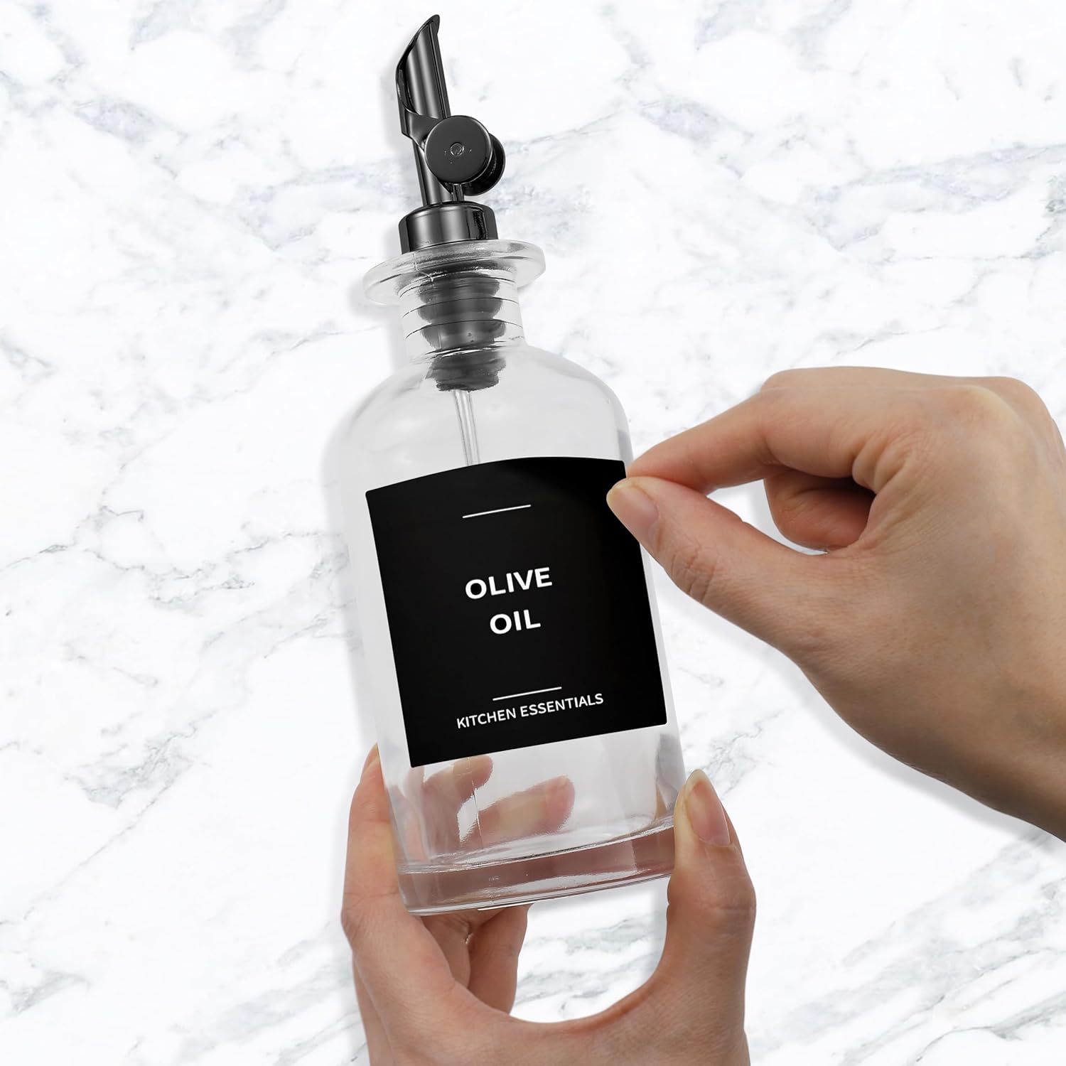 - Includes 55 Sticker Labels β Customize your glass oil dispenser thanks to the complimentary 55 waterproof and oil proof sticker labels made from PVC. Each label is minimalistic and clearly shows the contents of the bottle for convenience and decor.