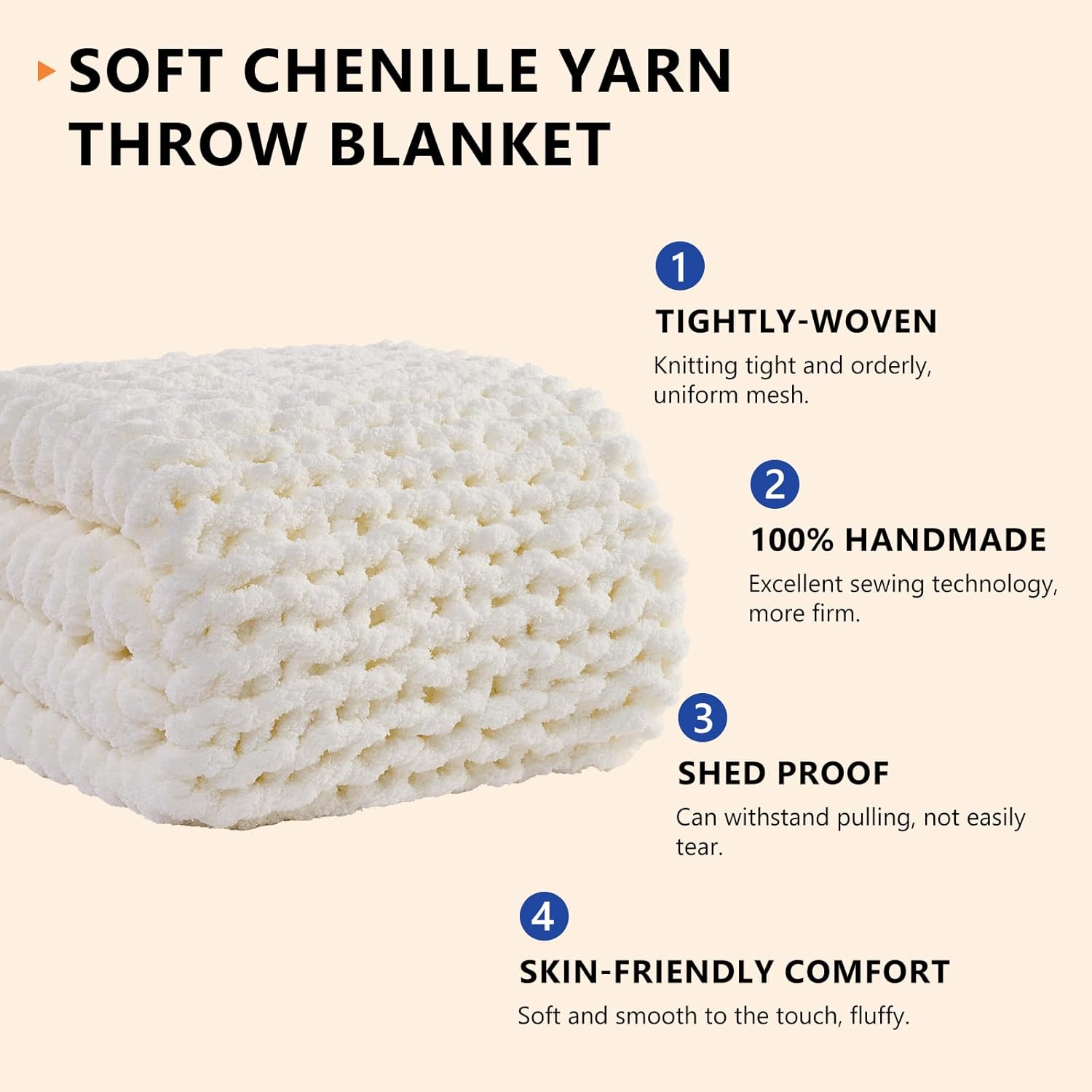 L'AGRATY Chunky Knit Blanket Throw: Soft Chenille Yarn Throw Blanket 60x80 - Handmade Thick Cable Crochet Blanket - Large Chunky Rope Throw Blanket for Couch Sofa Bed Home Decor(Cream White)