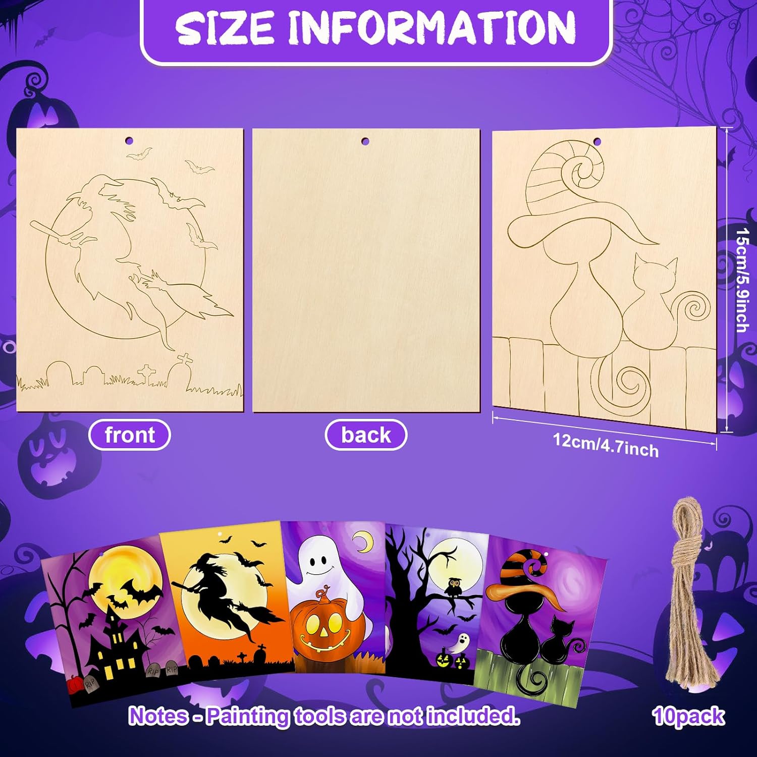 COCHIE 10PCS Large Halloween Unfinished Wood Crafts to Paint for Adults Kids, Bulk Predrilled Wooden Ornaments for Painting, Ghost Witch Bats Paintable Wood Slices Craft Supplies with Ropes