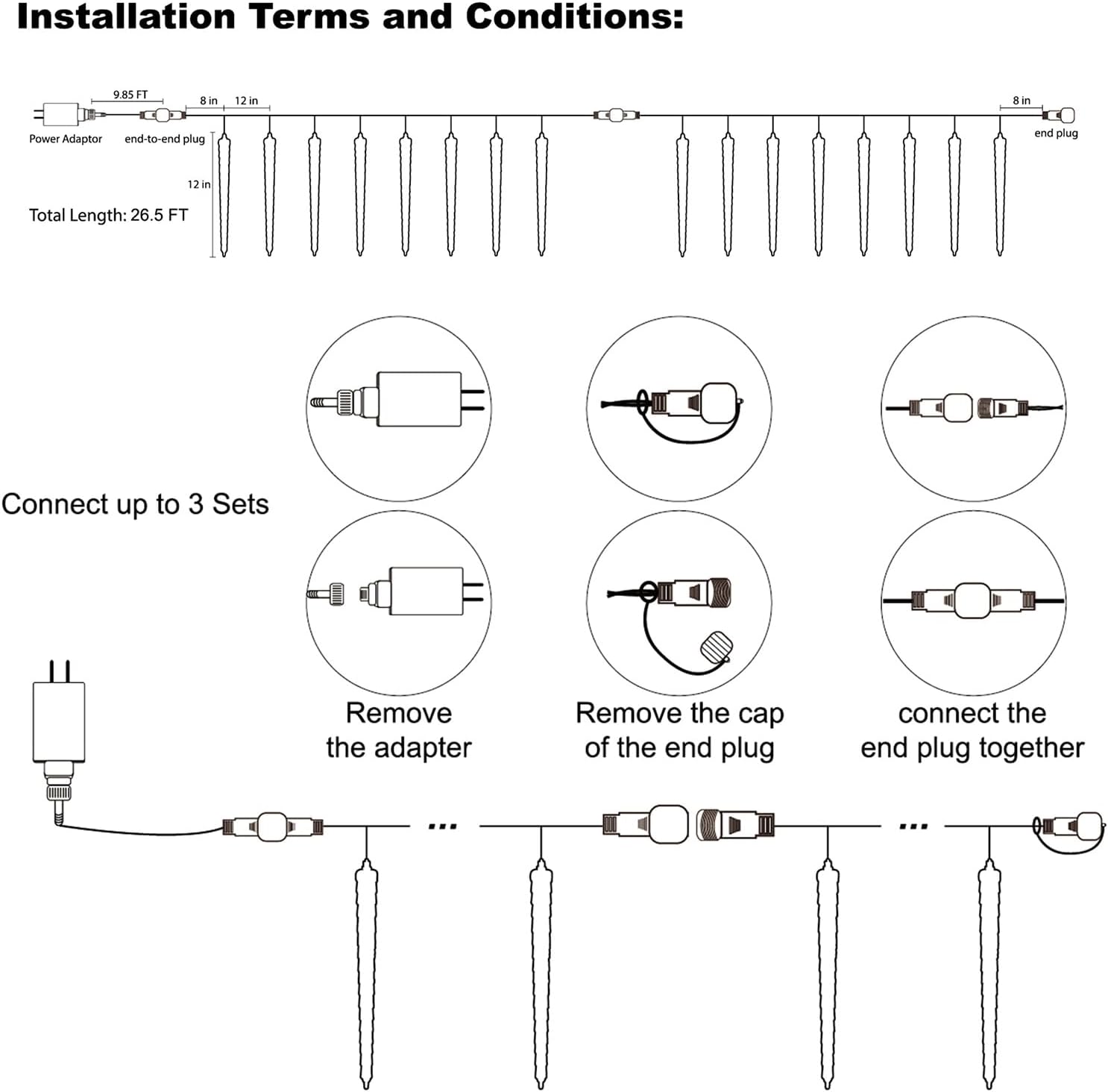 - Connectable Length: These icicle falling string lights have 16 tubes, each icicle tube is 12 inches long, each has 24 SMD LED beads, and the brightness is consistent from any angle. There is a connector plug on the front end, can be end-to-end extended to a max of 3 sets, and be powered by only one plug conveniently