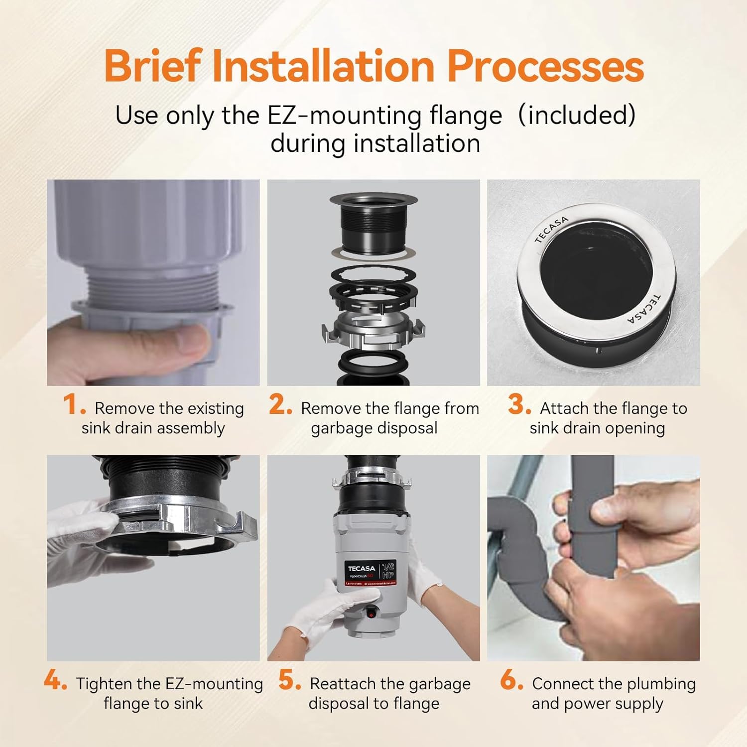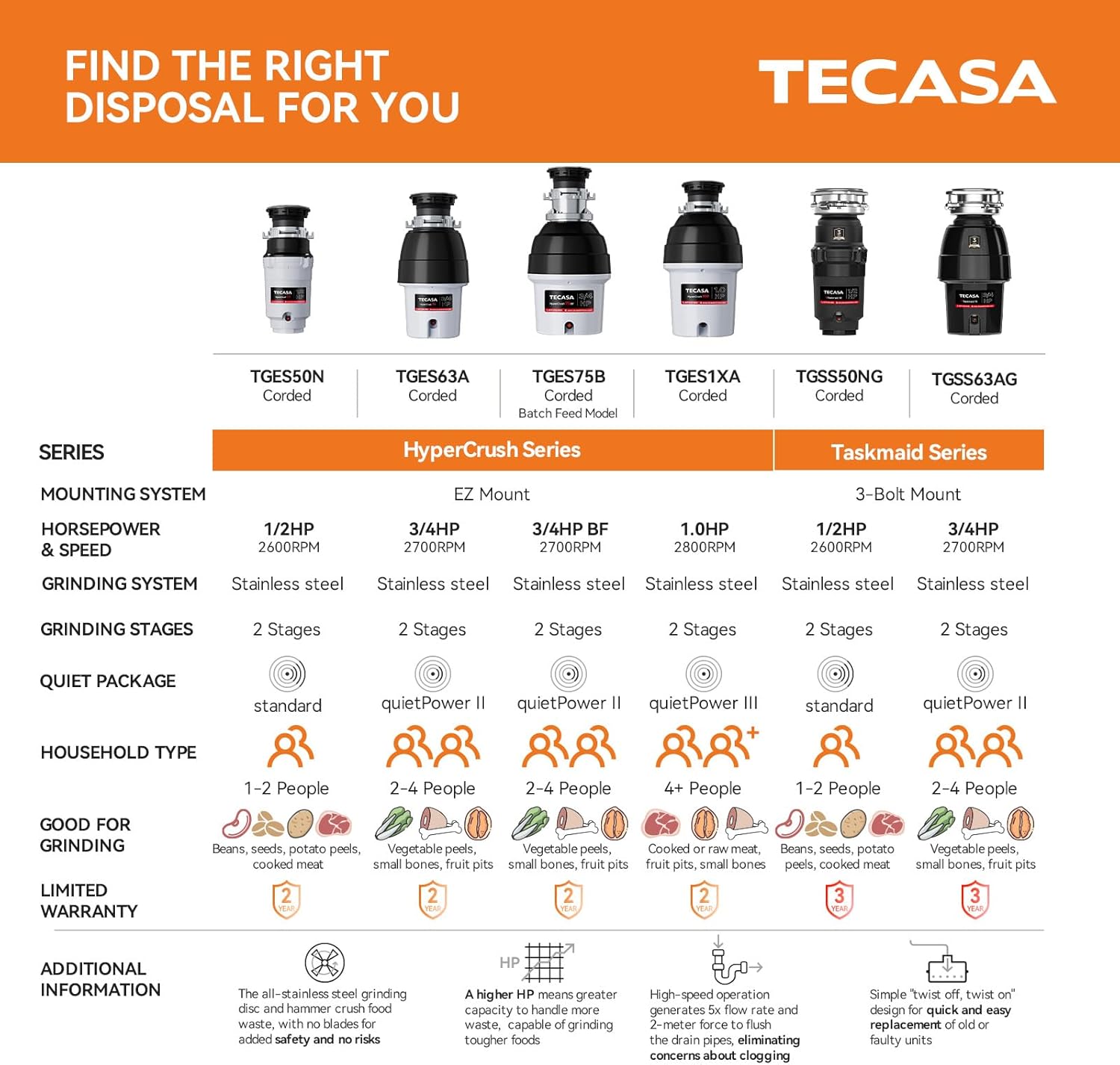 - ๐/๐ ๐๐: The TECASA 1/2 HP garbage disposal is ideal for most home kitchens, fitting standard 3-1/2 inch sink openings. It comes with a pre-installed 39" power cord for quick and easy electrical connection. The compact, space-saving design features a DC motor that delivers instant, enhanced torque for efficient grinding operations.